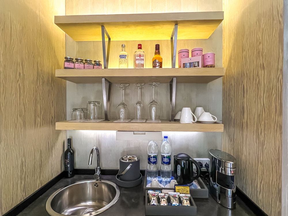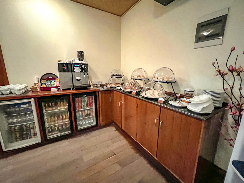 The lounge offers some refreshments with coffee and some delicacies. The toilet is located outside the living room.