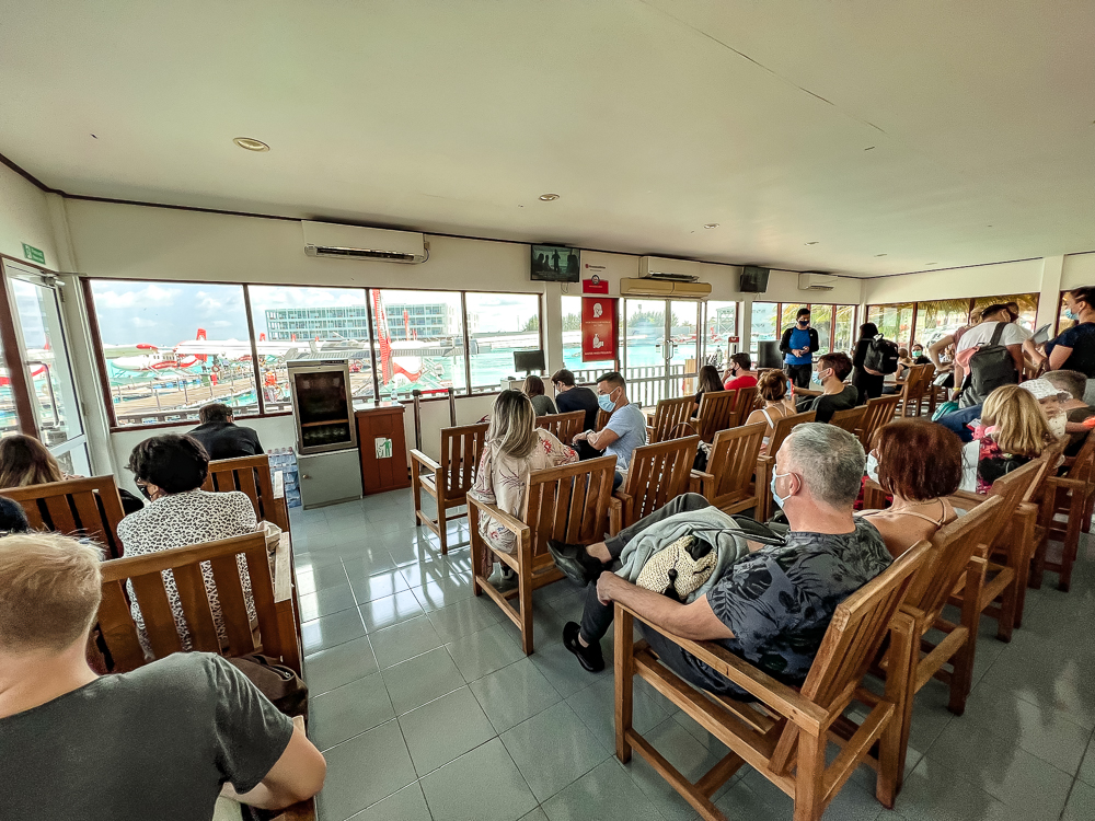 Our seaplane was dropping off guests at different hotels, so we had to wait for other passengers. The person in charge will finally come to pick us up and take us a few minutes away to the boarding gate. 15 minutes of waiting in a glass room and we finally boarded.