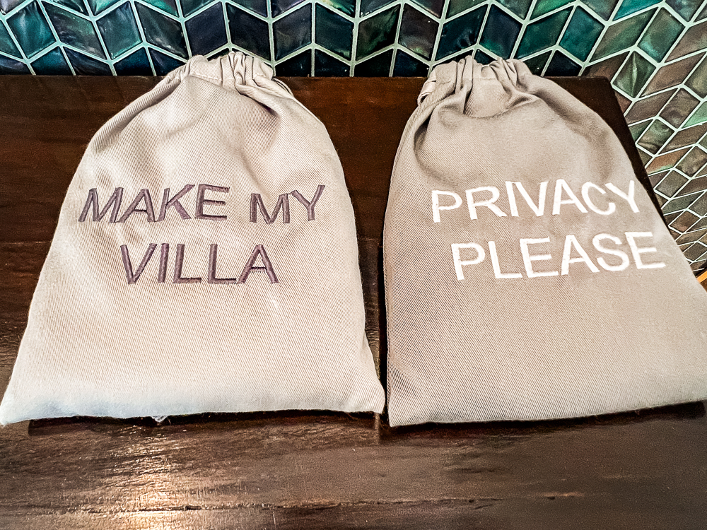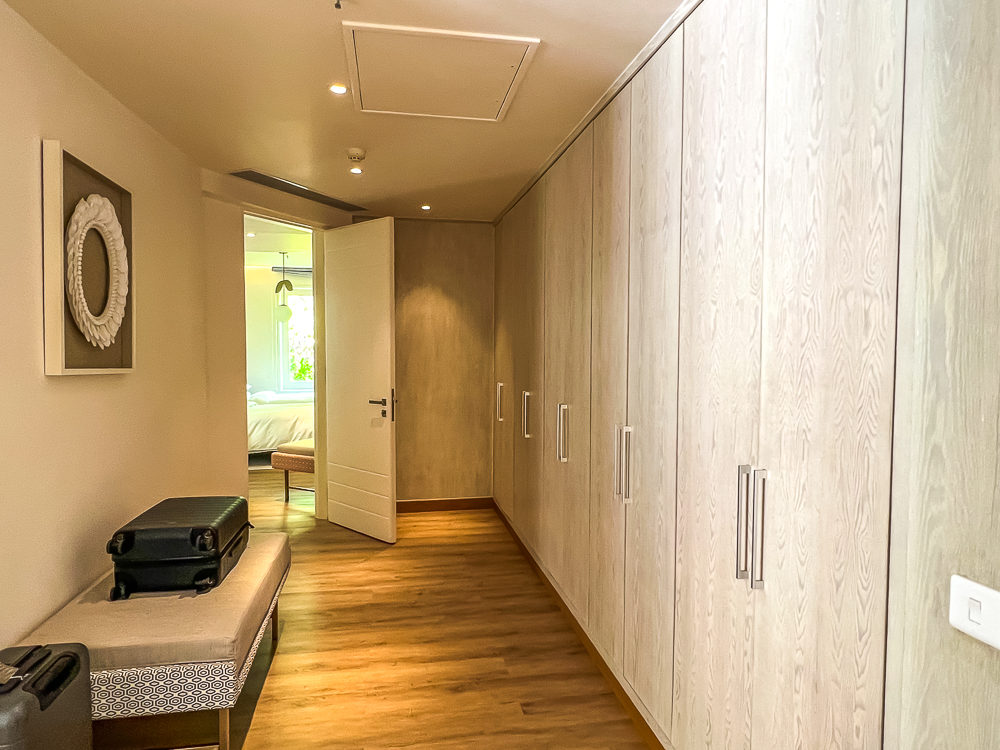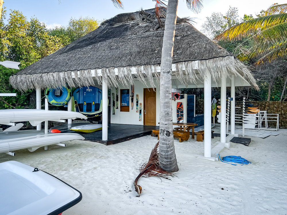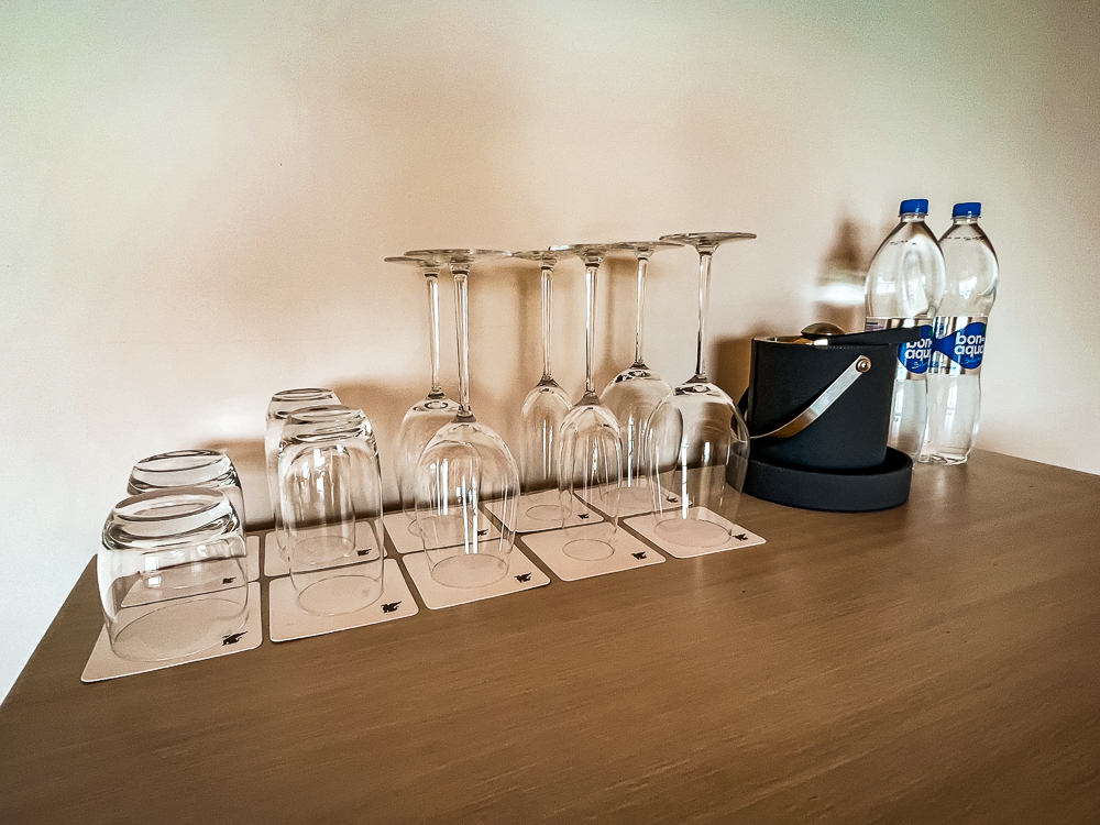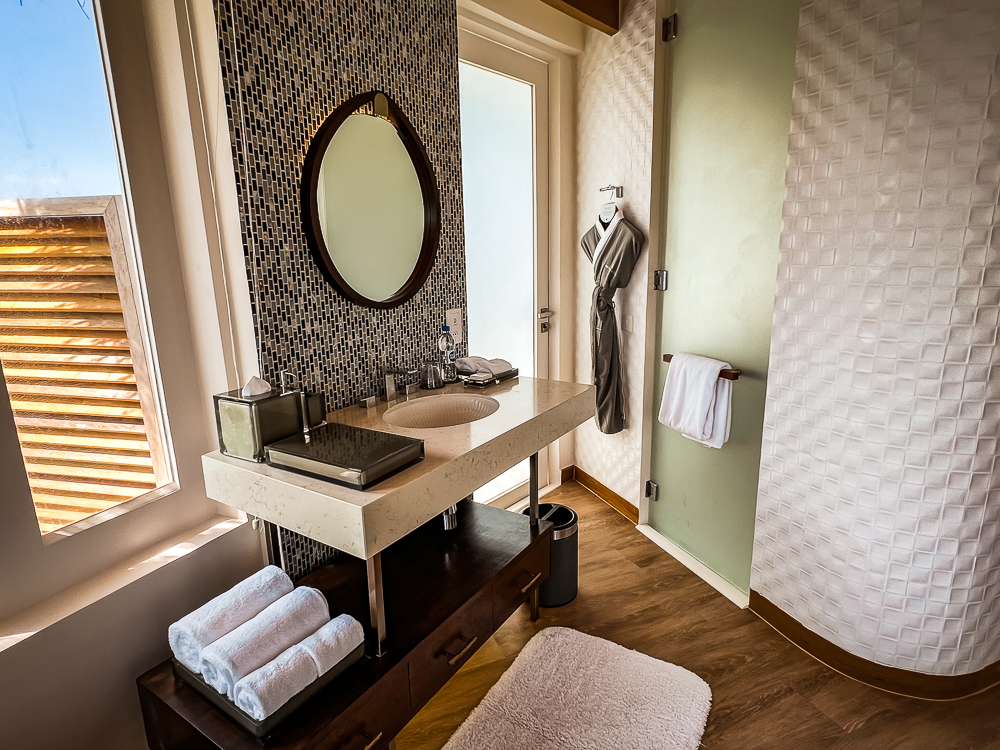 Each villa has a bar and a large dressing room. It includes slippers, bathrobes, flip-flops for men and women, a safe, an ironing board and a very practical beach bag that will follow us during our stay to carry fins, masks and towels on the beach.
