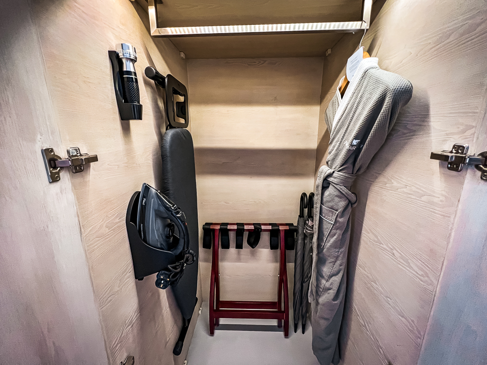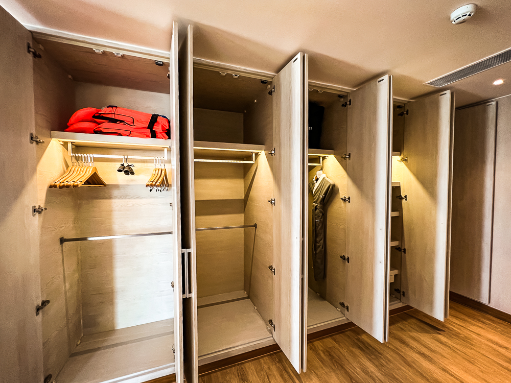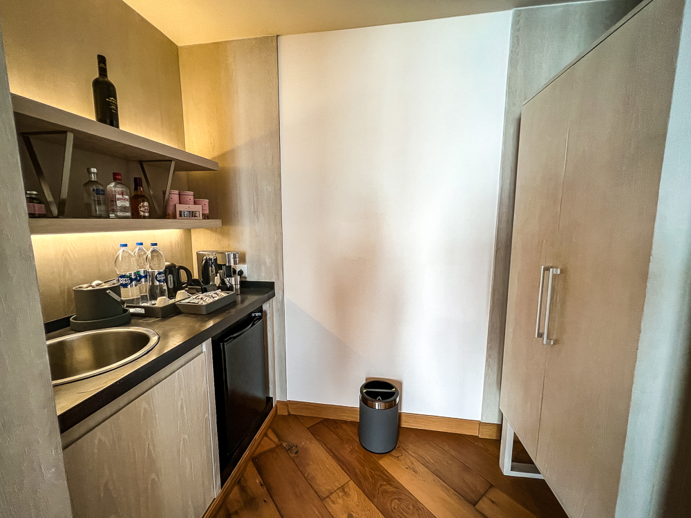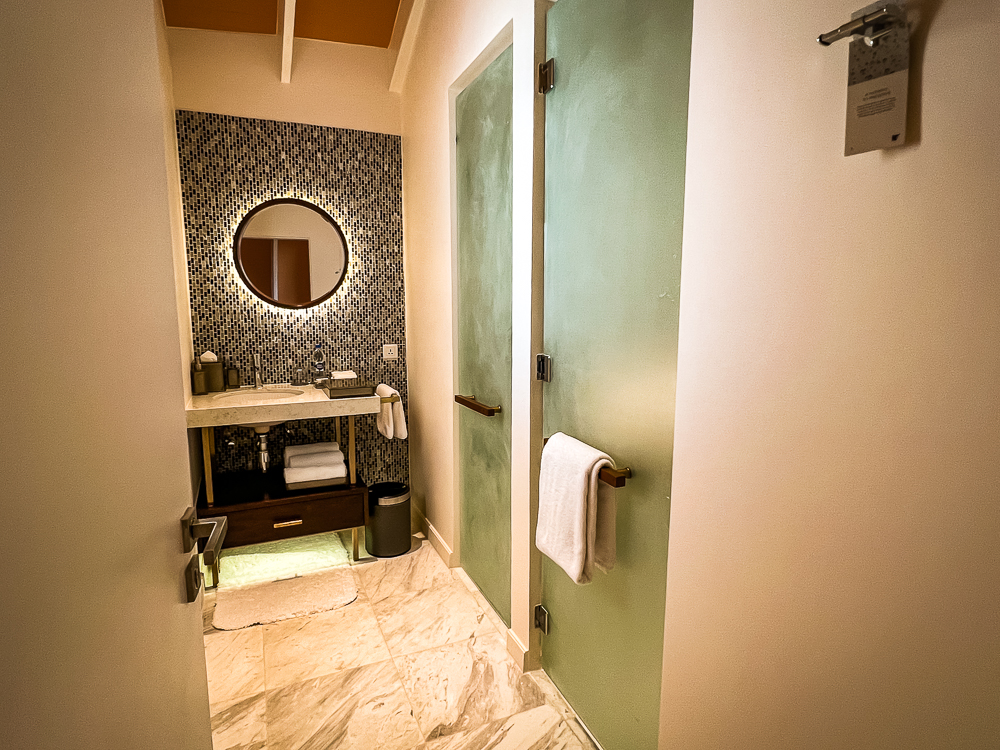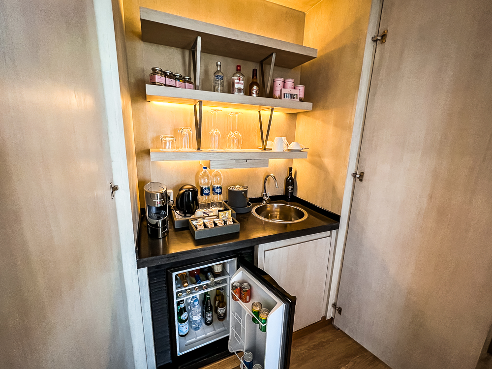Each villa has a bar and a large dressing room. It includes slippers, bathrobes, flip-flops for men and women, a safe, an ironing board and a very practical beach bag that will follow us during our stay to carry fins, masks and towels on the beach.