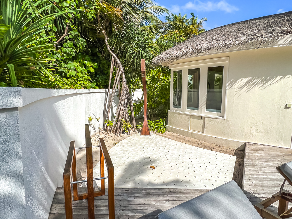 The access is direct from the bathroom to the outdoor terrace for both the stilt and beach villas.