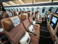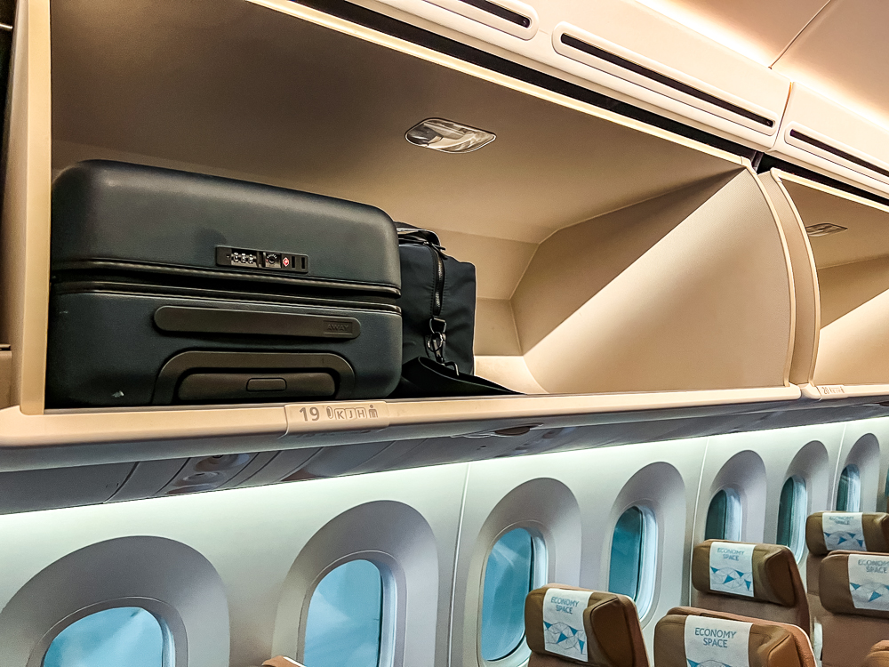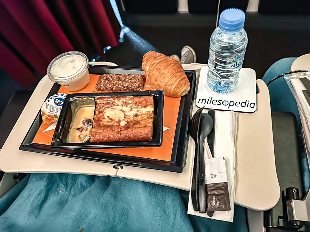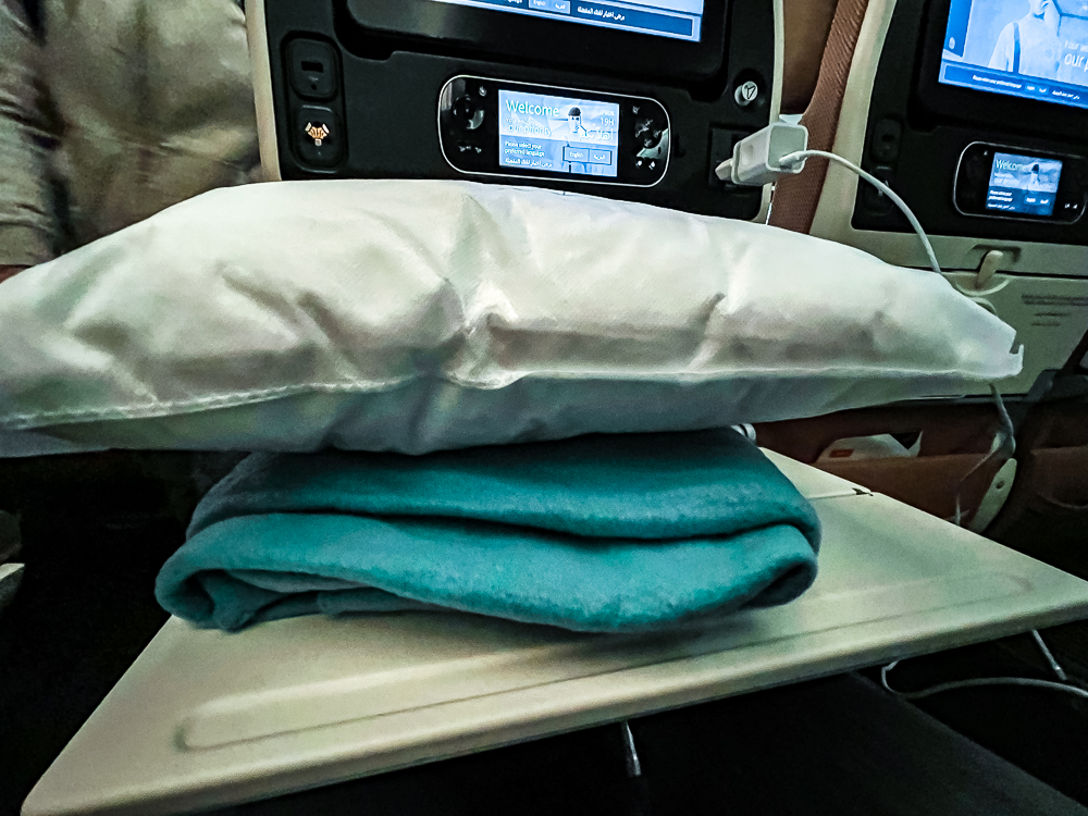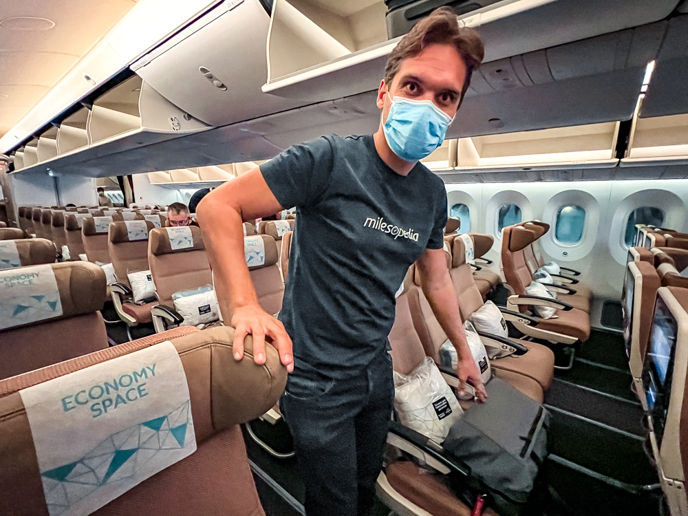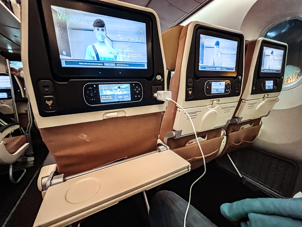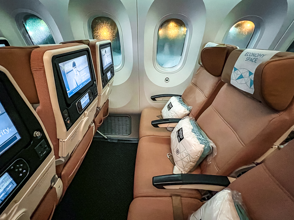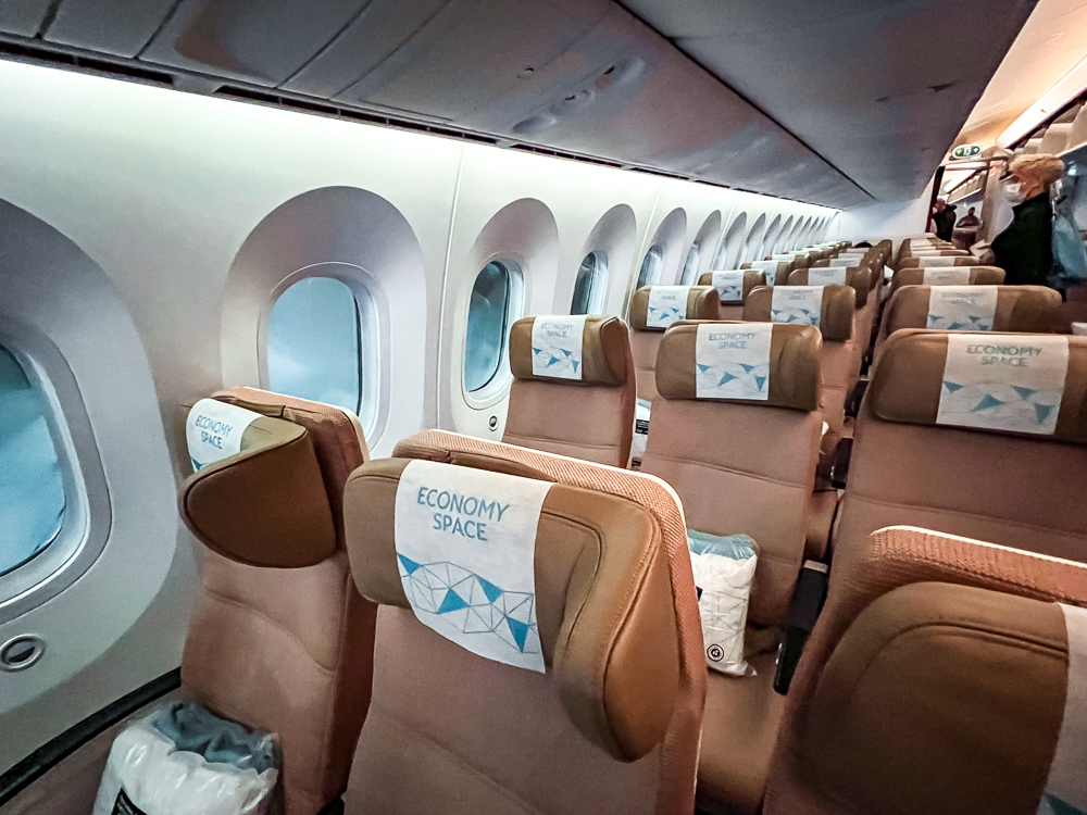 As a couple, we had to pay extra to sit side by side on the plane. Jean-Maximilien had chosen our seats on the aisle side, one central and one lateral. We waited until after boarding to quickly move to the empty front seats – more leg room, and to be next to each other. With the agreement of the crew of course.