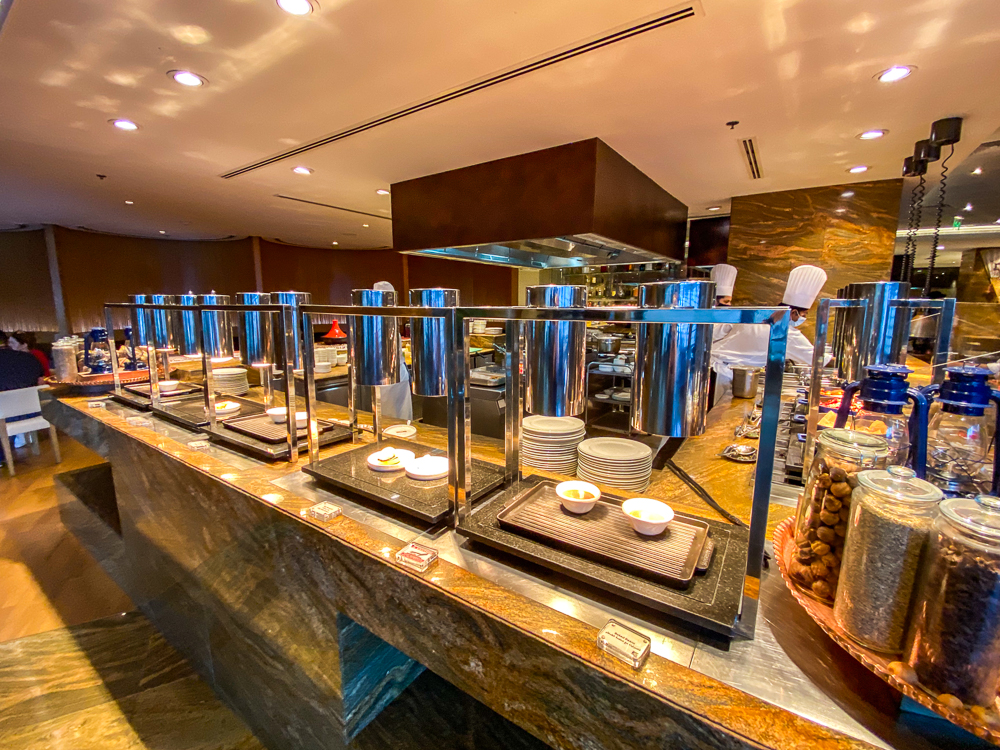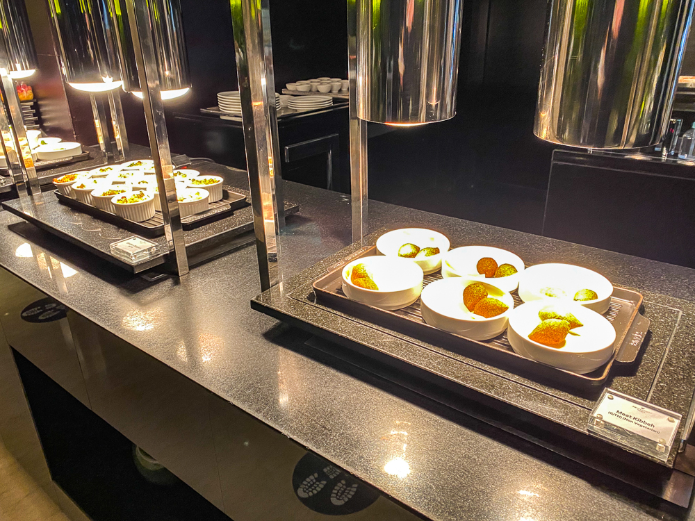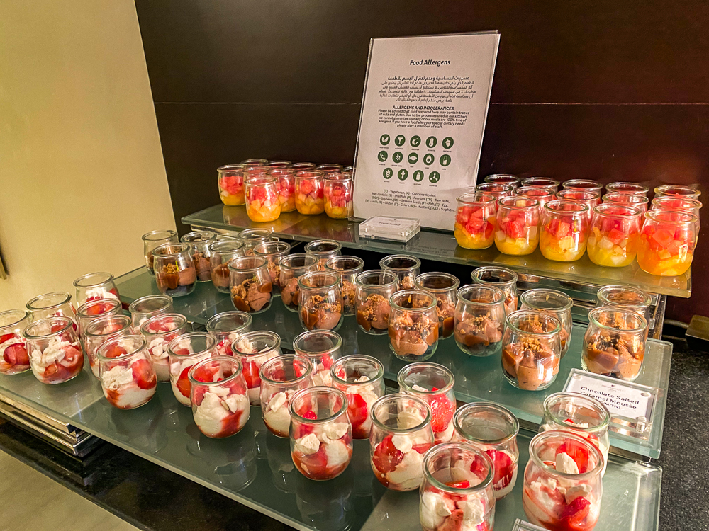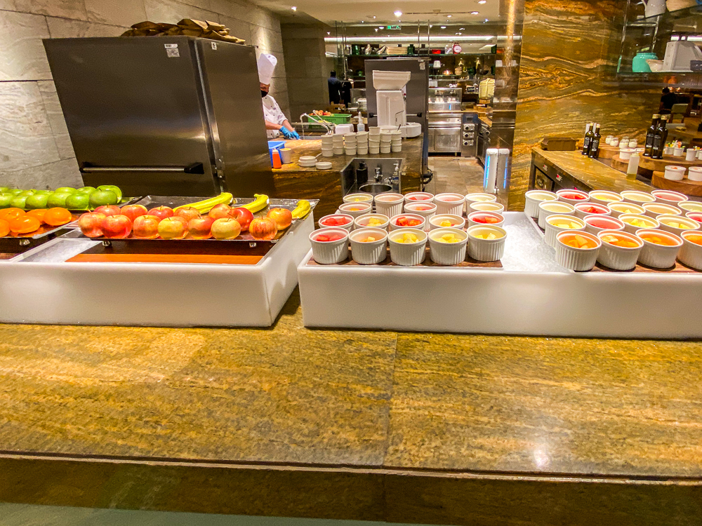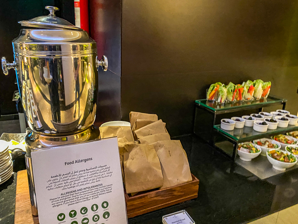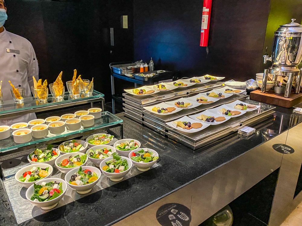 The Executive Lounge is available to members with Platinum or higher Marriott Bonvoy status. It is located on the 37th floor of Tower A and offers magnificent views of the surroundings of Dubai. There are several rooms to sit either at the table or in lower armchairs with coffee tables. The lighting is dimmed.