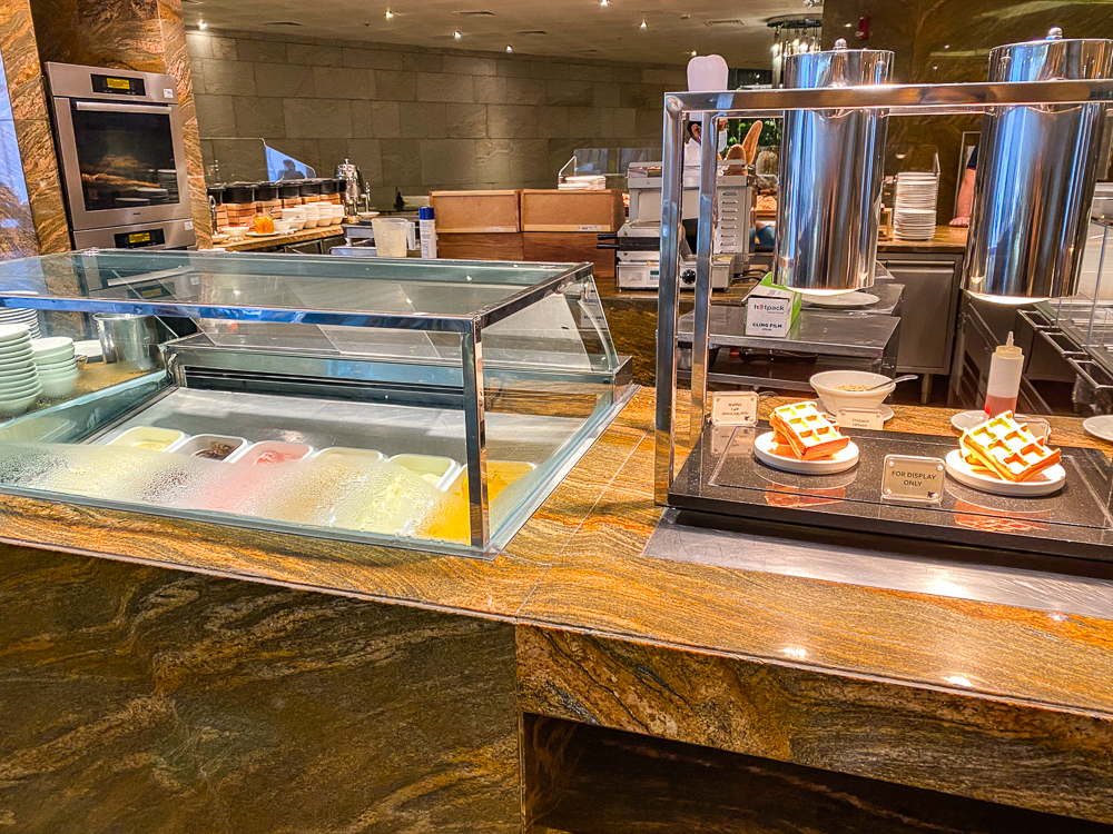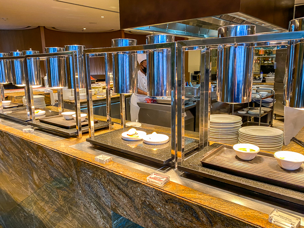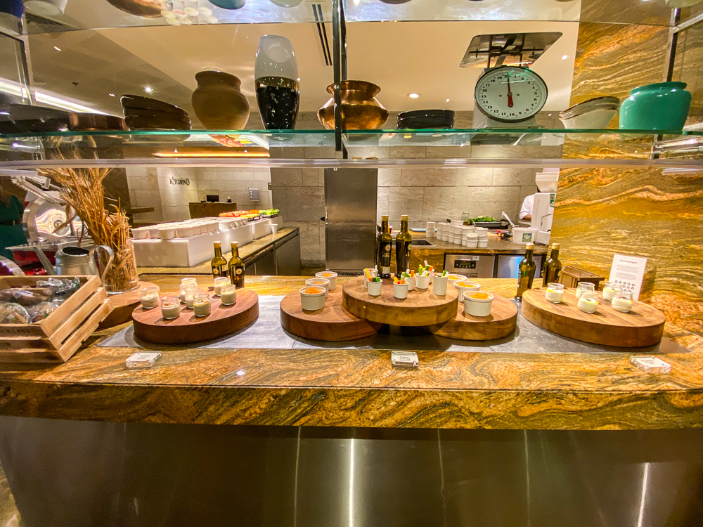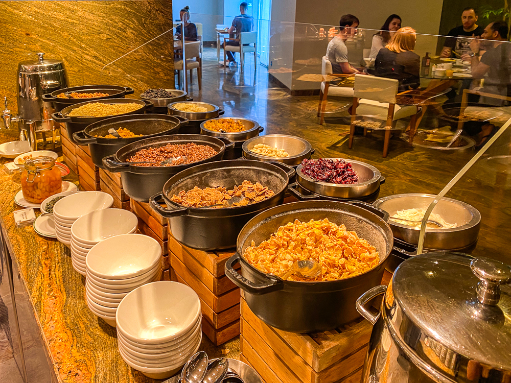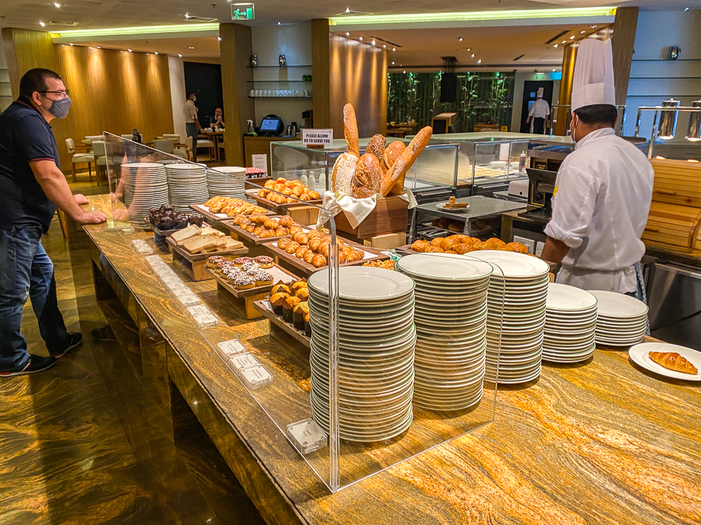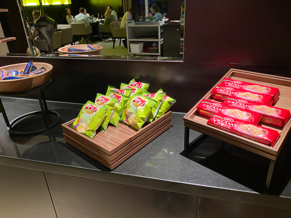 The Executive Lounge is available to members with Platinum or higher Marriott Bonvoy status. It is located on the 37th floor of Tower A and offers magnificent views of the surroundings of Dubai. There are several rooms to sit either at the table or in lower armchairs with coffee tables. The lighting is dimmed.