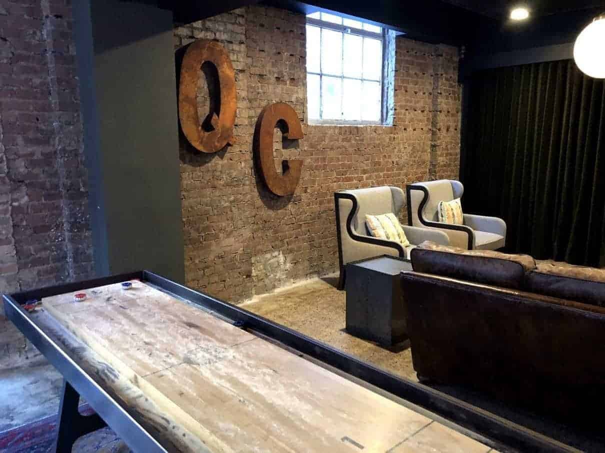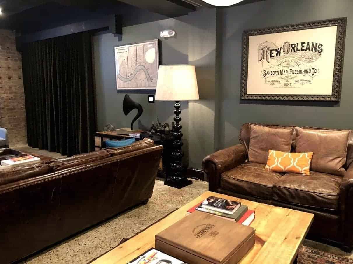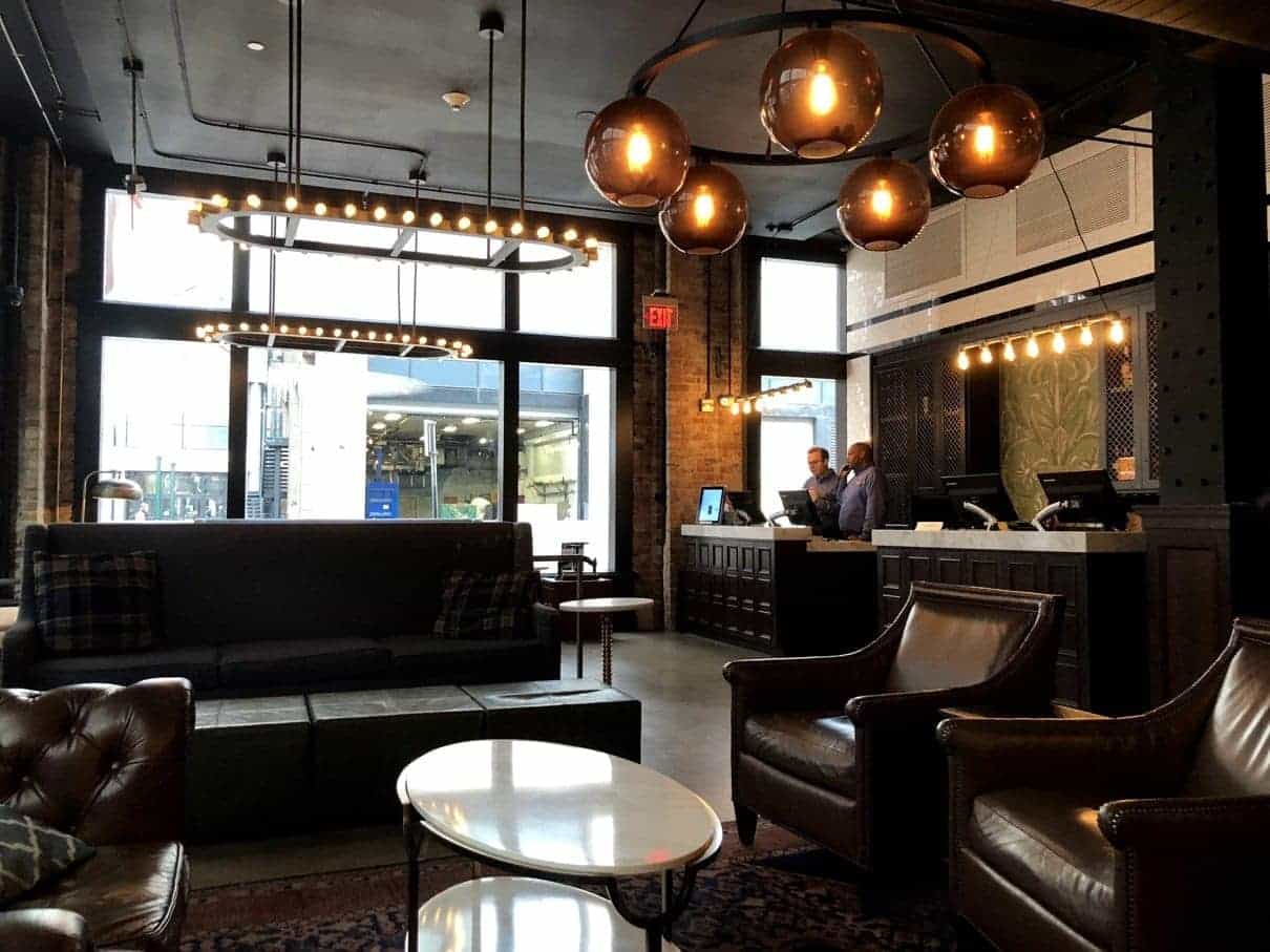 The atmosphere is different from traditional hotels. You can see a lobby with leather sofas of different style, industrial lights, a rather dark decor.