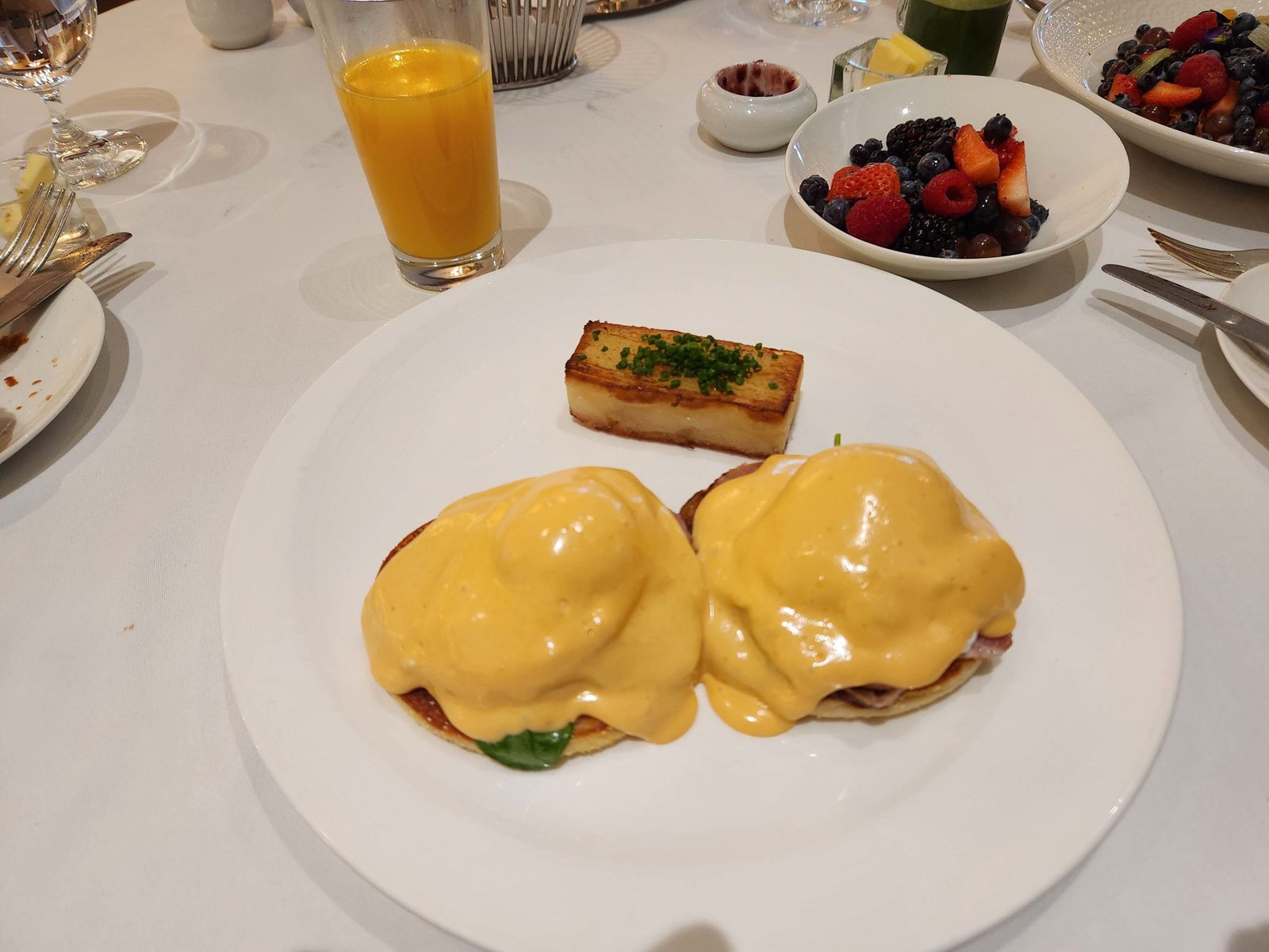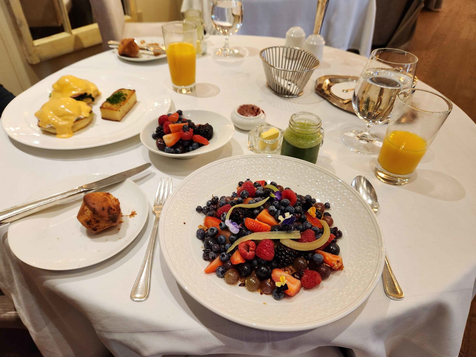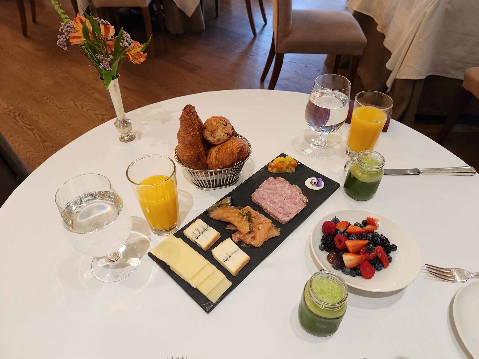 The next morning we had breakfast in the restaurant. This is normally $40/person, but was included for us in our room package. It comes with a serving platter to share which features cheese, paté, local root veggies, and smoked salmon. We were also offered coffee, tea, juice, and their locally-created “greens” smoothie which is made with spinach, kale, and various other superfoods to help your day get off to a good start. For the main course I ordered eggs benedict and my wife had a granola and fruit platter. Needless to say it was all absolutely delicious. We didn’t have huge appetites due to our large meal the night before, so the staff were happy to box up our cold leftovers for us to snack on later which we kept in our fridge in our room.