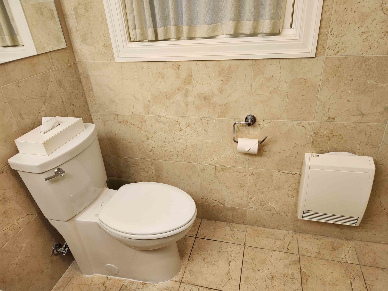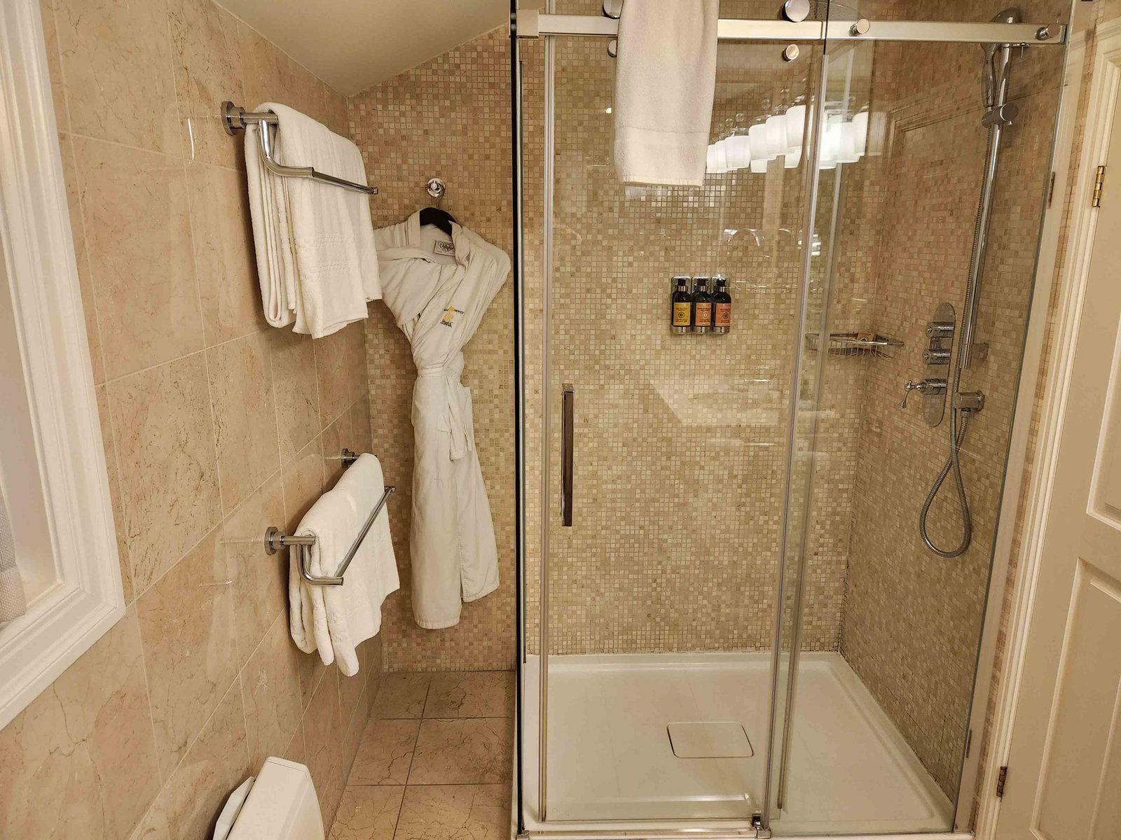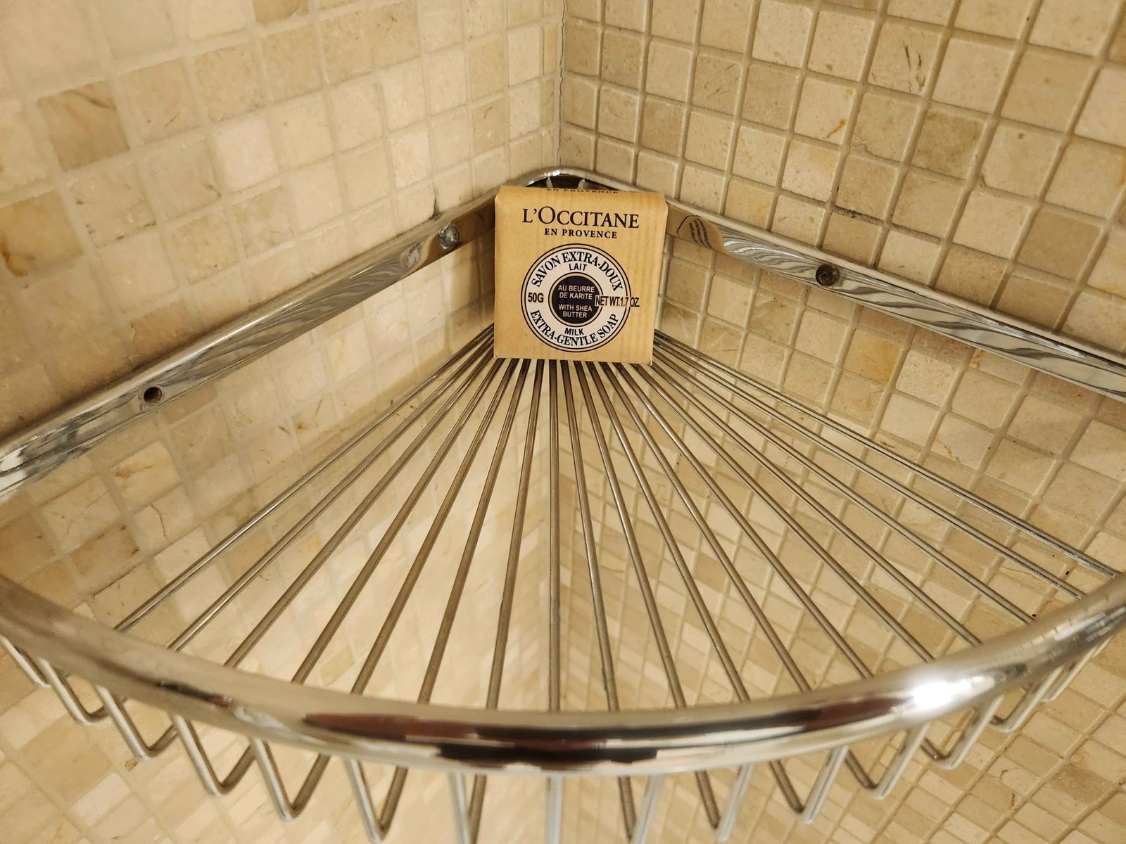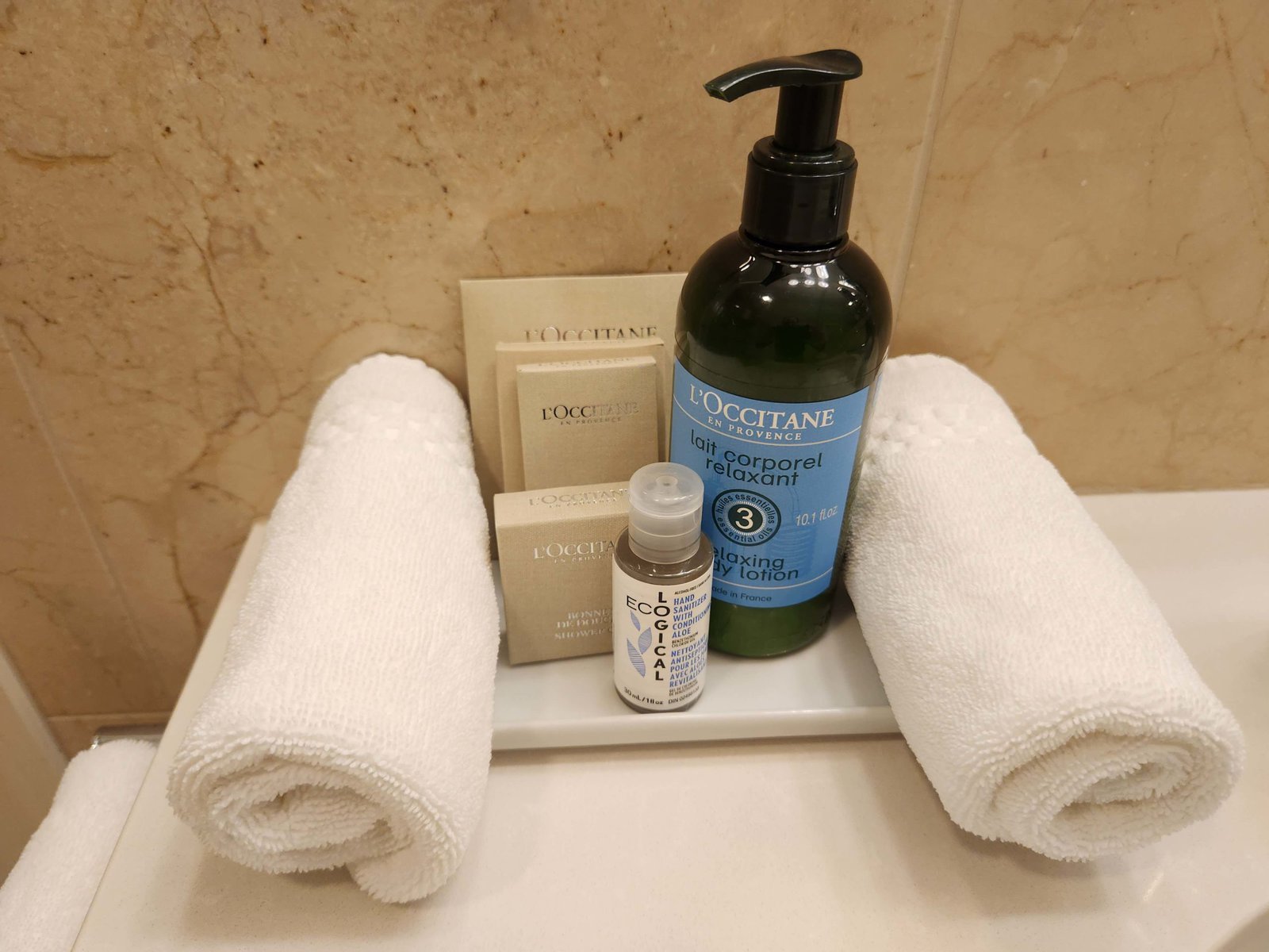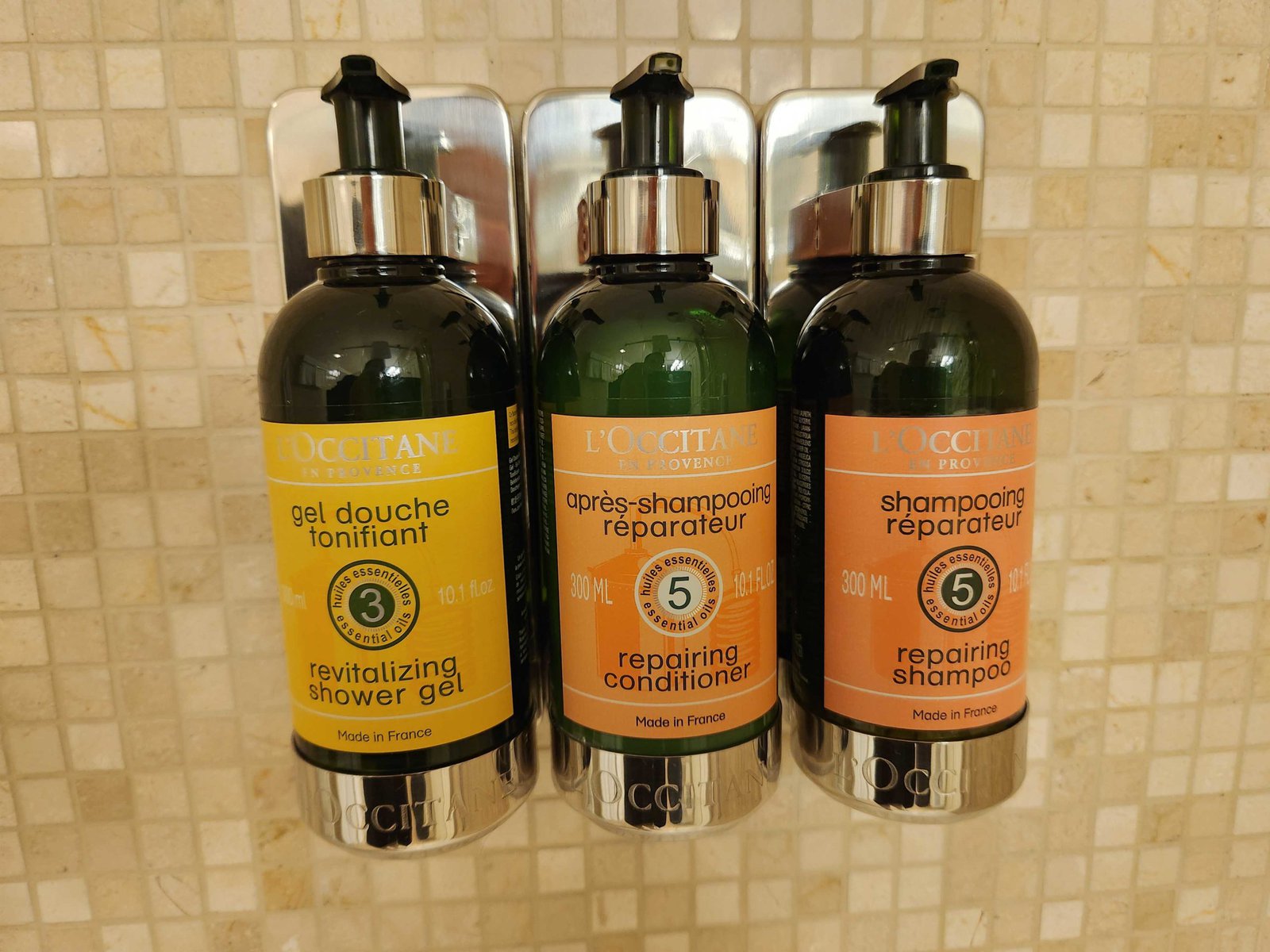 The washroom styling was a mix of marble and tiles, and featured a rainfall shower, two robes, and plenty of L’Occitane personal products and vanity kit items.