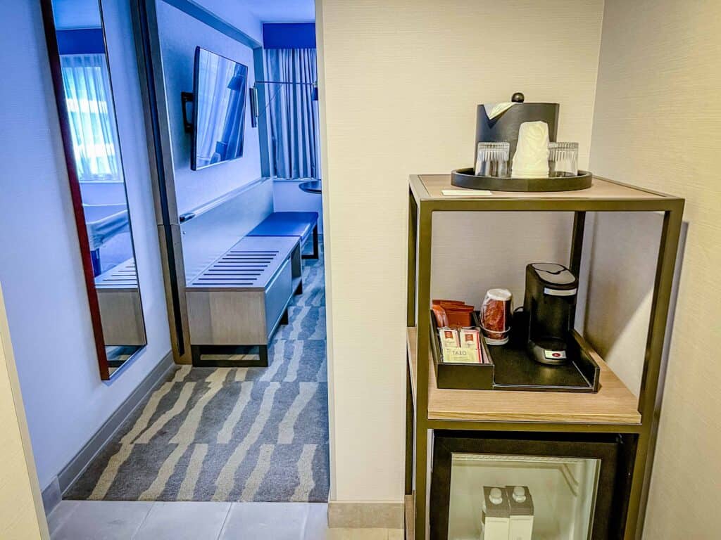 The beds were cozy, and they came with fluffy pillows and an electrical outlet that was conveniently placed on the side of each bed. A flat-screen smart TV, a mini-fridge, and a coffee maker were included in the room’s amenities.