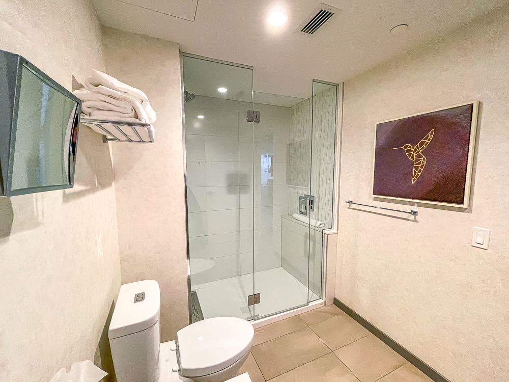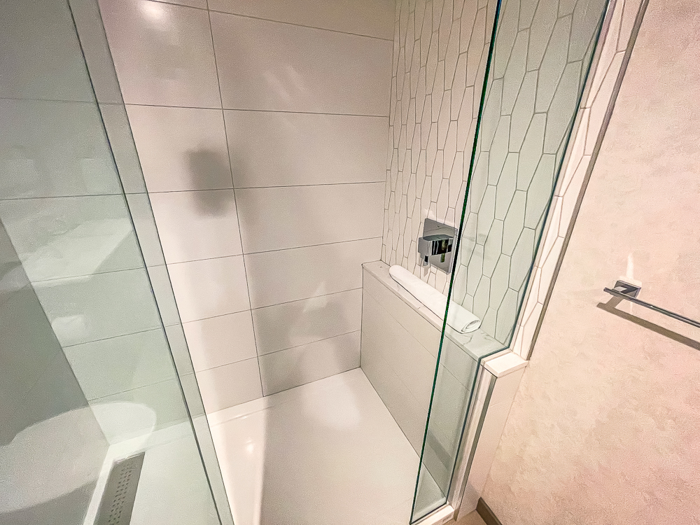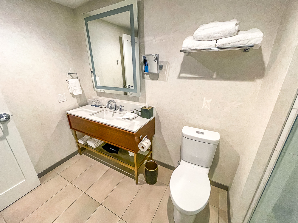 The bathroom had a walk-in shower, large sink, backlit mirror and hairdryer. Note that the shower was nice and warm but with a rather low water pressure.