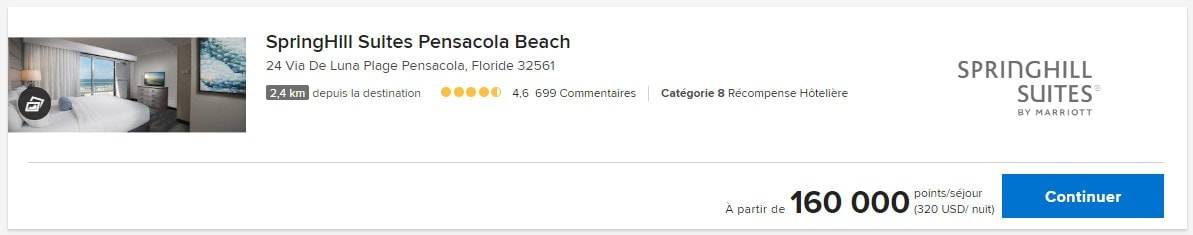 The Springhill Suites by Marriott Pensacola Beach hotel is rated as a Category 8 as of July 2018: so it costs 40,000 points/night (instead of US$320 + tax) or 160,000 points for 5 nights (instead of US$1,600 + tax).