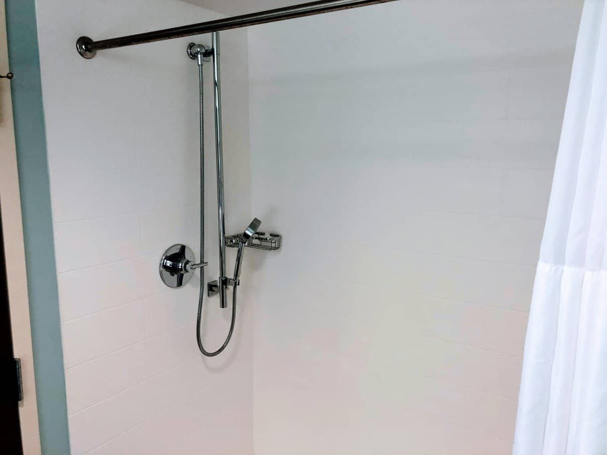 Between the living room and the bedroom is the bathroom. Instead of a bathtub, a large shower.