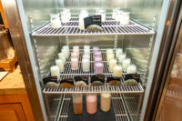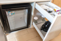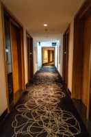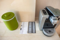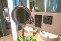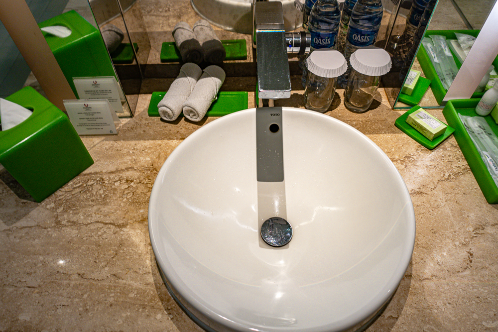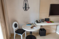 A welcome gift was waiting for us on the desk. The TV faces the beds above the narrow countertop desk. The décor is modern in keeping with the hotel’s contemporary style. A fridge is available.