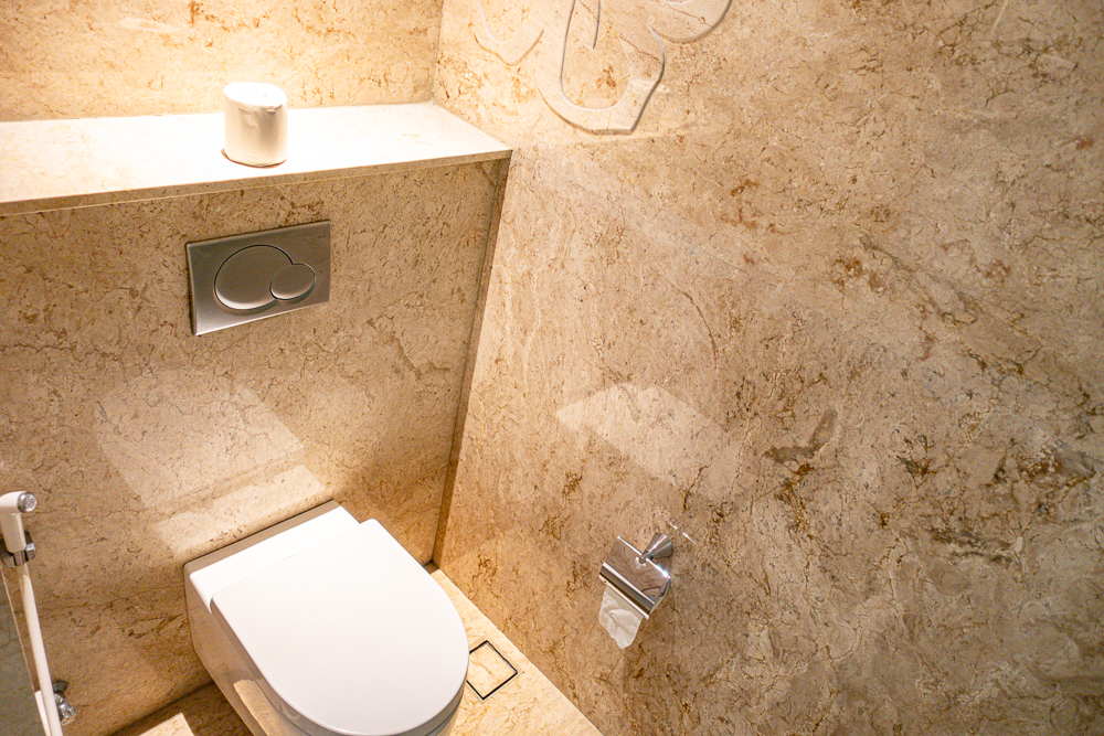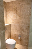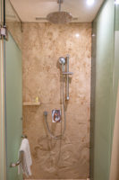 The bathroom is located directly at the entrance of the room. A thick curtain can give the room some privacy by separating it from the bedroom. There is no bathtub, but a shower. For a bath, you will have to go to the private pool.