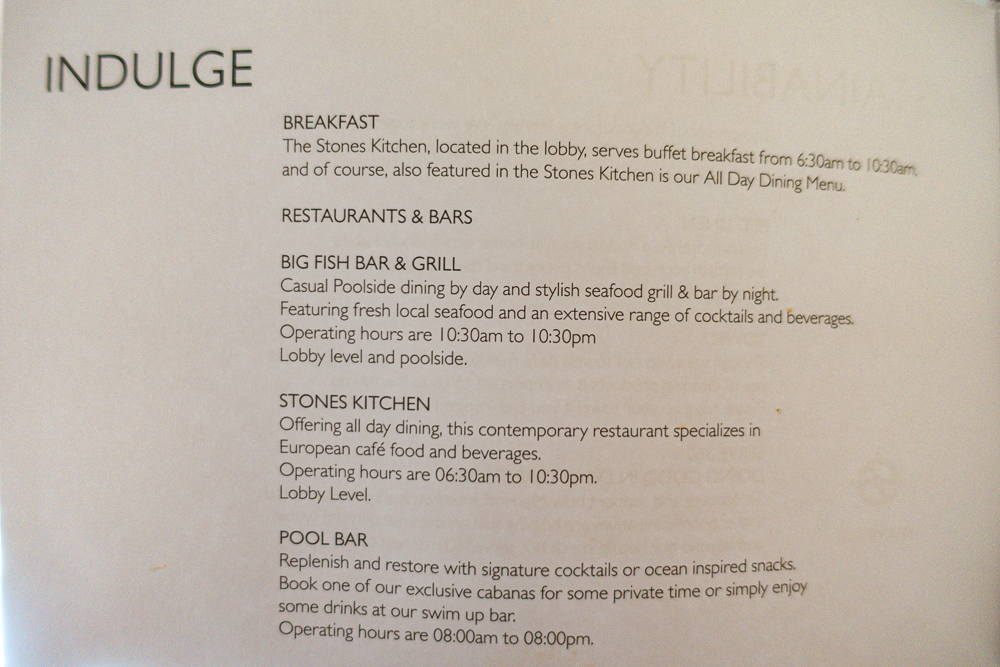 The hotel offers a choice of activities and restaurants. You can go to the main restaurant, Stones Kitchen (which also serves lunch), the Big Fish Bar & Grill or have a drink at the pool bar.