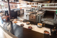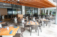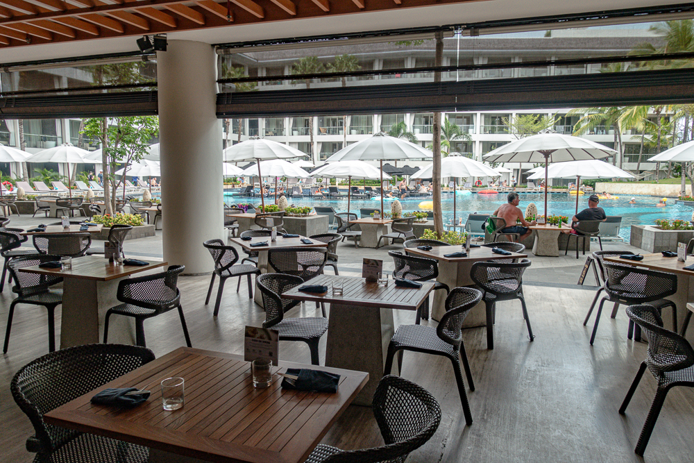 The restaurant is located right next to the pool under the canopy.