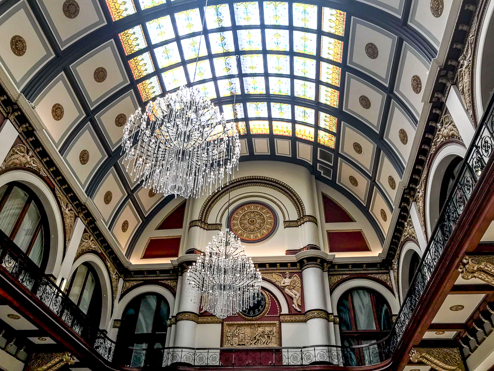 The high stained glass ceiling, bas-relief, marble, gilding, crystal, candlesticks and period fireplace give the place a castle feel.