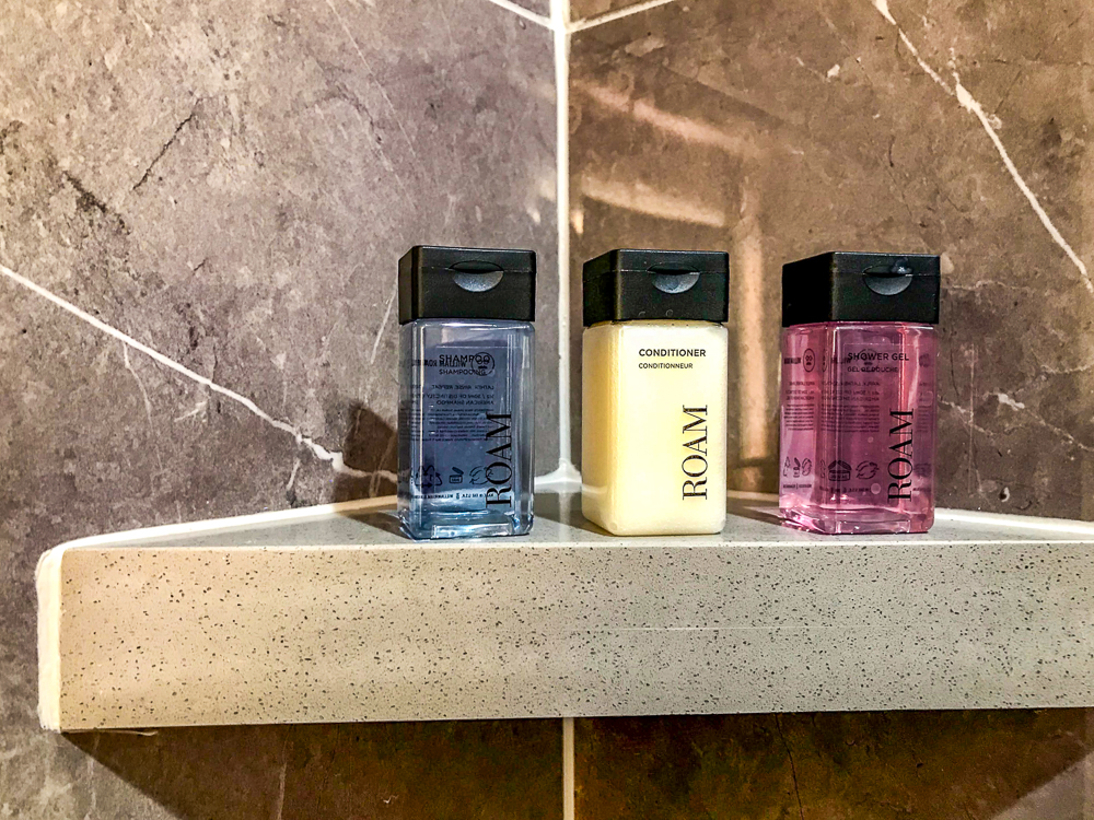 The bathroom has a bath and a shower with rain head. Nothing’s missing. Products, accessories and towels.