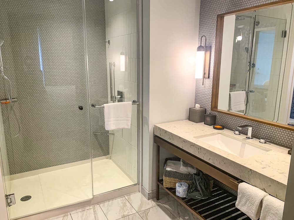 The bathroom features a large shower and vanity unit with sink. Towels are placed in a wicker basket.