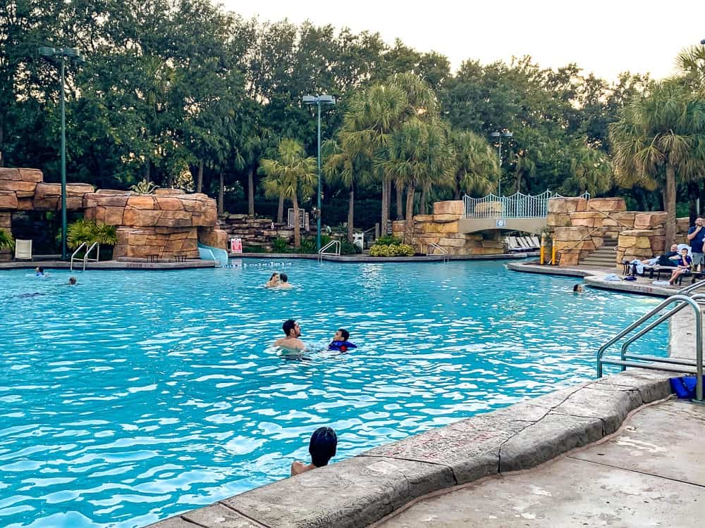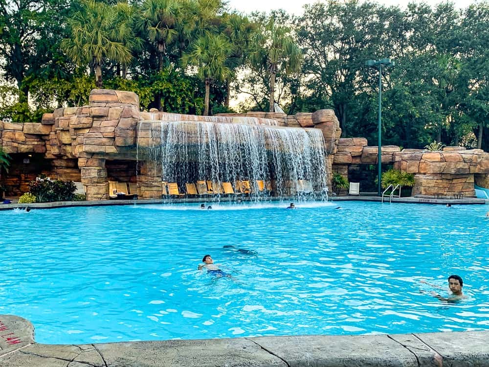 The Walt Disney World Dolphin’s huge Grotto Pool with its bridges, rocks, waterfall and slide is extraordinary.