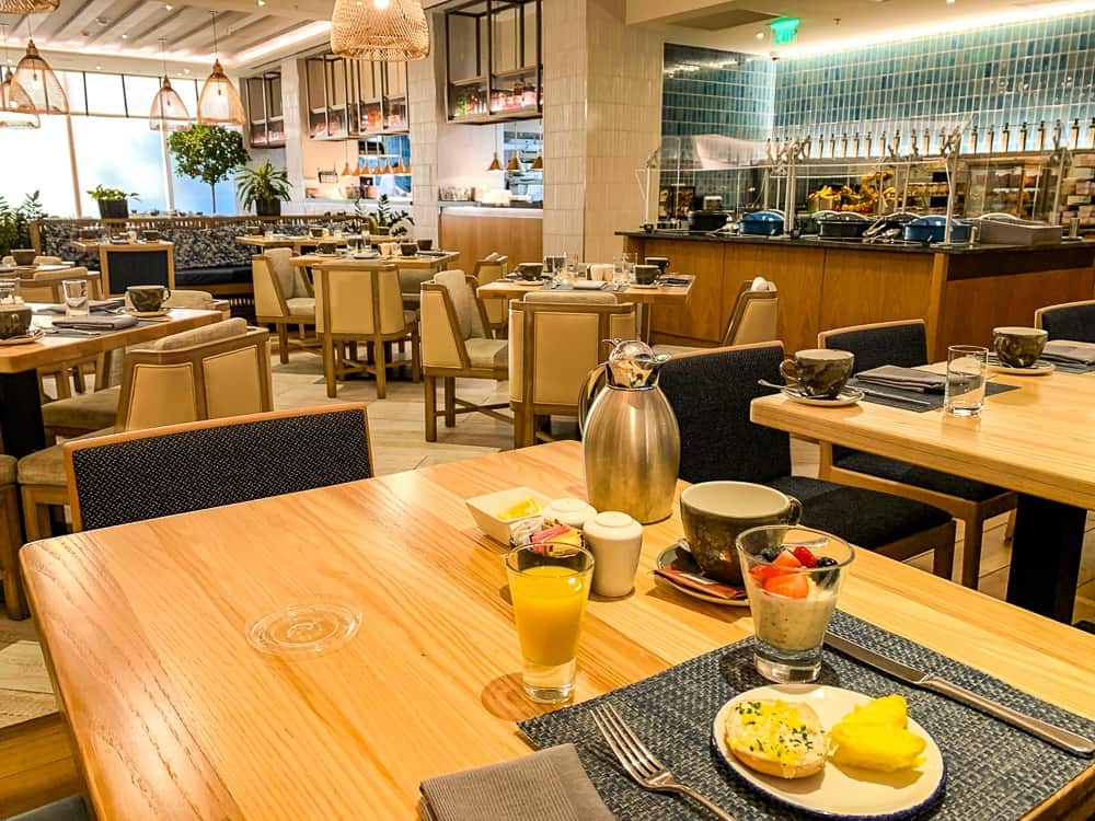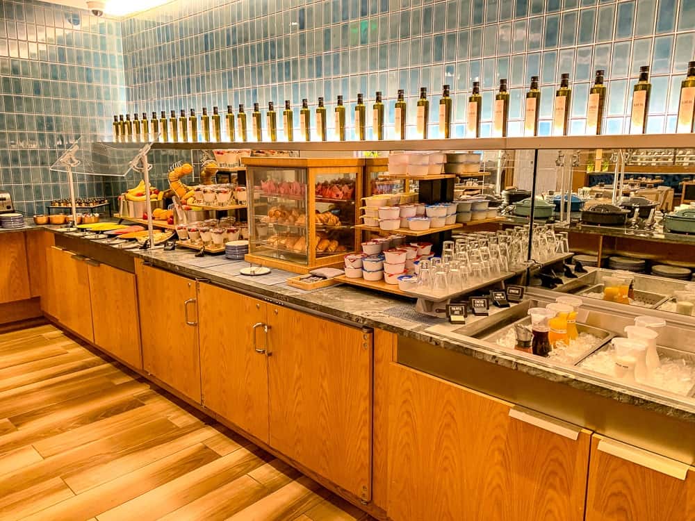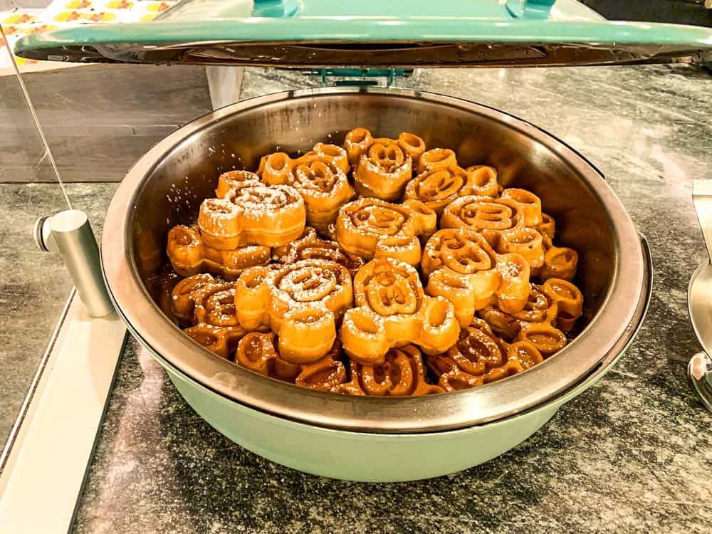 To access the island with the hot portion of the buffet with bacon, scrambled eggs, oatmeal, sausages and Michey Mouse waffles, it cost an additional 10 USD per person.