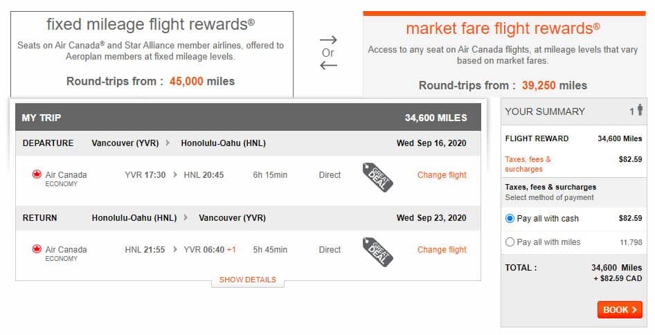 Here is, for example, a September flight from Vancouver to Honolulu. Usually available at 45,000 miles Arplan round trip, it is accessible at 39,250 miles Aeroplan round trip at market rate.