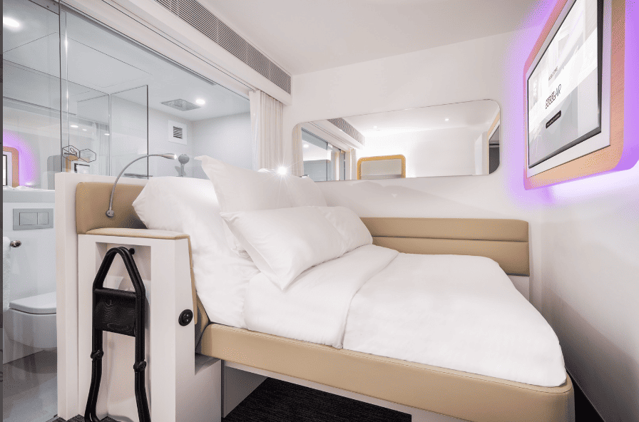The concept was developed to replicate a really nice first class suite on an airplane as a hotel room. This results in a smaller and more affordable transit hotel at an airport, without sacrificing any quality.