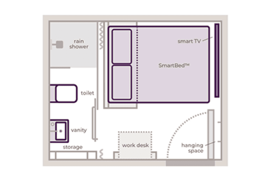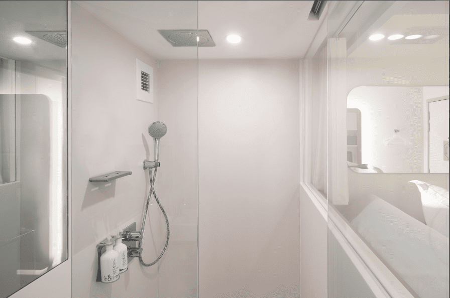 You have a small “cabin” which has a very comfortable bed, mood lighting, a desk for working, and a compact yet fully functional ensuite with sink, toilet, and rainfall shower.