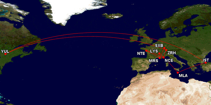 Pour le vol aller, j’avais trouvé il y a quelques jours un vol Montréal-Zurich-Nice pour seulement 45 000 miles Aéroplan et 79$ de taxes avant la dévaluation d’Aéroplan du 15 décembre 2015.