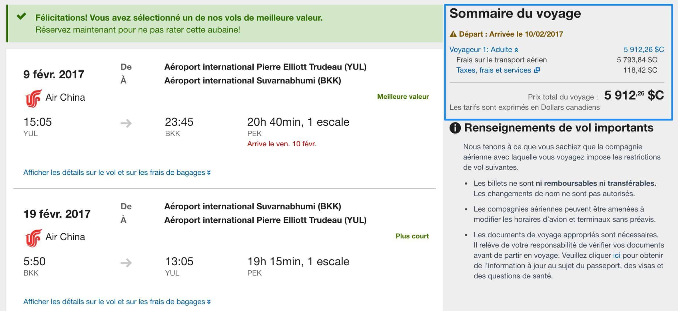 Et là en septembre 2016, une opportunité s’est présentée et nous vous avions d’ailleurs averti: Aéroplan permettait de nouveau de réserver sur la compagnie Air China avec ses miles.