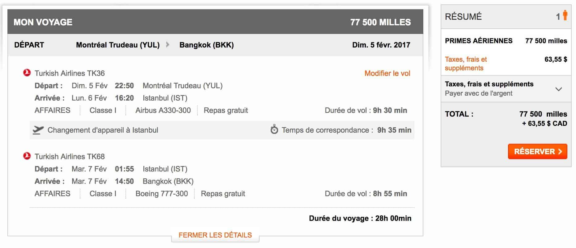 Nous avons pu chacun réserver 1 siège en classes affaires vers la Thaïlande pour un coût unitaire de 155 000 miles aéroplan et 118$.