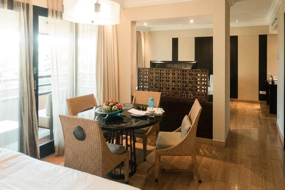 La vue donnait sur les piscines et les alentours. La très belle chambre était accompagnée d’un grand dressing où les enfants dormiront même (derrière les portes du miroir de la chambre) ! Nous avions même une salle de massage pour nous !