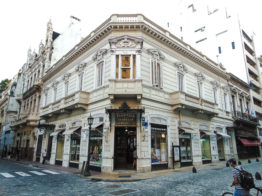 La pharmacie La Estrella est la plus ancienne pharmacie de Buenos Aires qui continue de fonctionner. L’intérieur nous invite à voyager dans le temps, avec ses étagères sculptées en bois de noyer, verre de Murano, marbre de Carrare, majolique vénitienne et verrières en fer forgé.