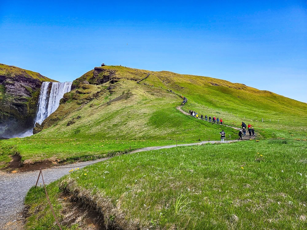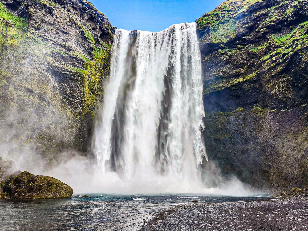 Skógafoss est l’une des plus grandes chutes d’Islande, connue pour son impressionnant rideau d’eau puissant d’une hauteur de 60 mètres. Les visiteurs peuvent s’approcher de la base de la cascade ou monter les escaliers pour une vue panoramique depuis le sommet.