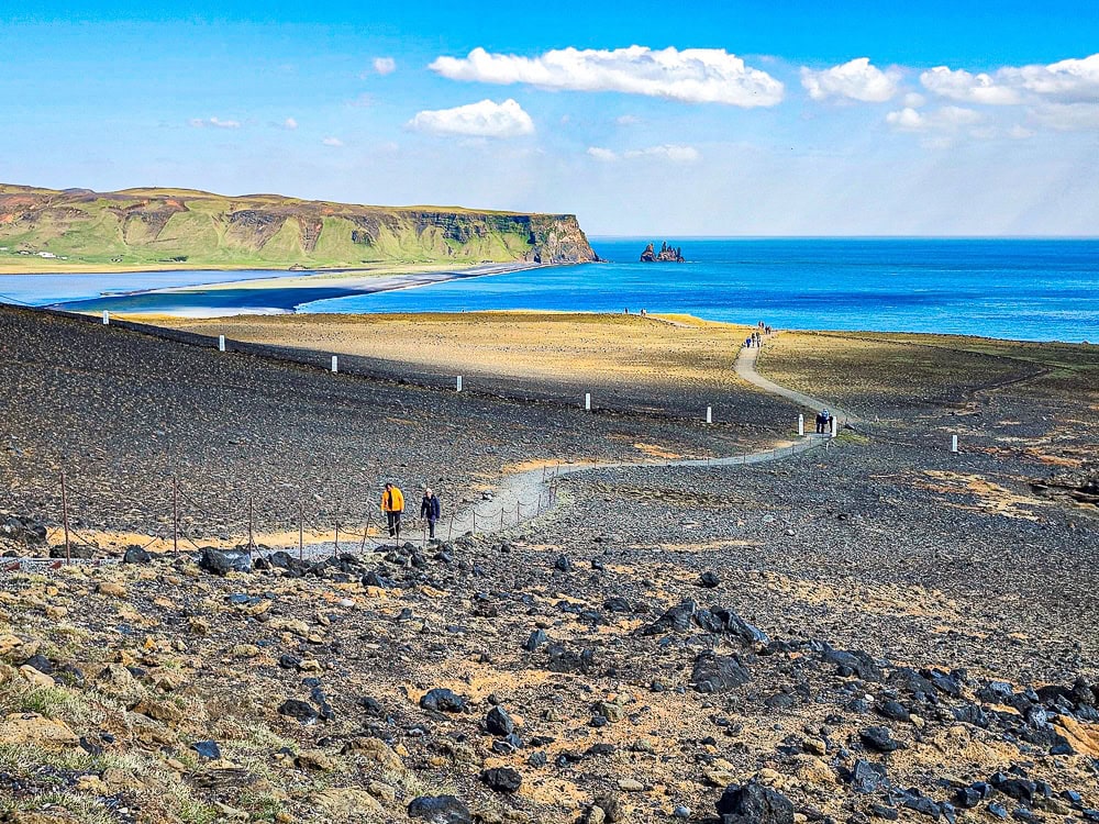 Un promontoire en hauteur accessible en voiture qui offre une vue panoramique époustouflante sur la côte sud de l’Islande, avec ses falaises escarpées, ses arches naturelles et ses plages de sable noir. C’est également un site prisé pour l’observation des oiseaux, notamment des macareux, qui nichent dans les falaises environnantes.