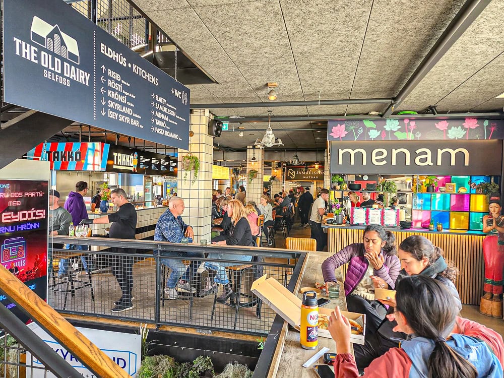 Le « Food Hall » à l’ancienne laiterie de Selfoss, propose une expérience culinaire à ne pas manquer pour le souper sur le chemin du retour vers la capitale. Dans un cadre historique charmant, le lieu propose une variété de plats locaux islandais et de saveurs internationales, servis dans une atmosphère conviviale. Un concept unique en Islande, mais dont la formule a fait ses preuves un peu partout ailleurs dans le monde.