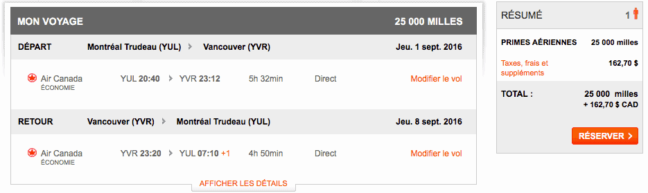 Autrement dit, vous faites ici une excellente utilisation des miles Aéroplan puisque, une fois les taxes payées, vos 25 000 miles vous auront fait épargner 744$ (vous faisant retirer quasiment 3 cents par mile alors qu’on estime la valeur d’un mile à 1,7 cent!).