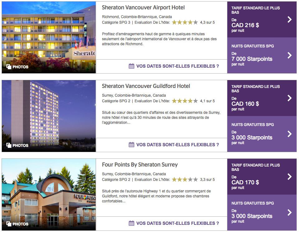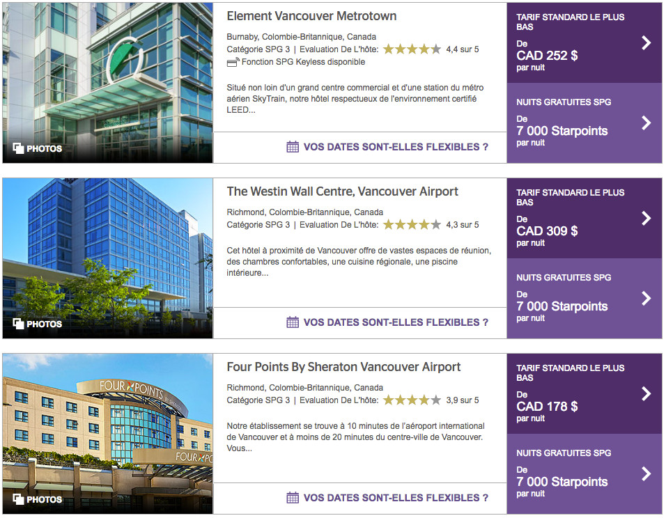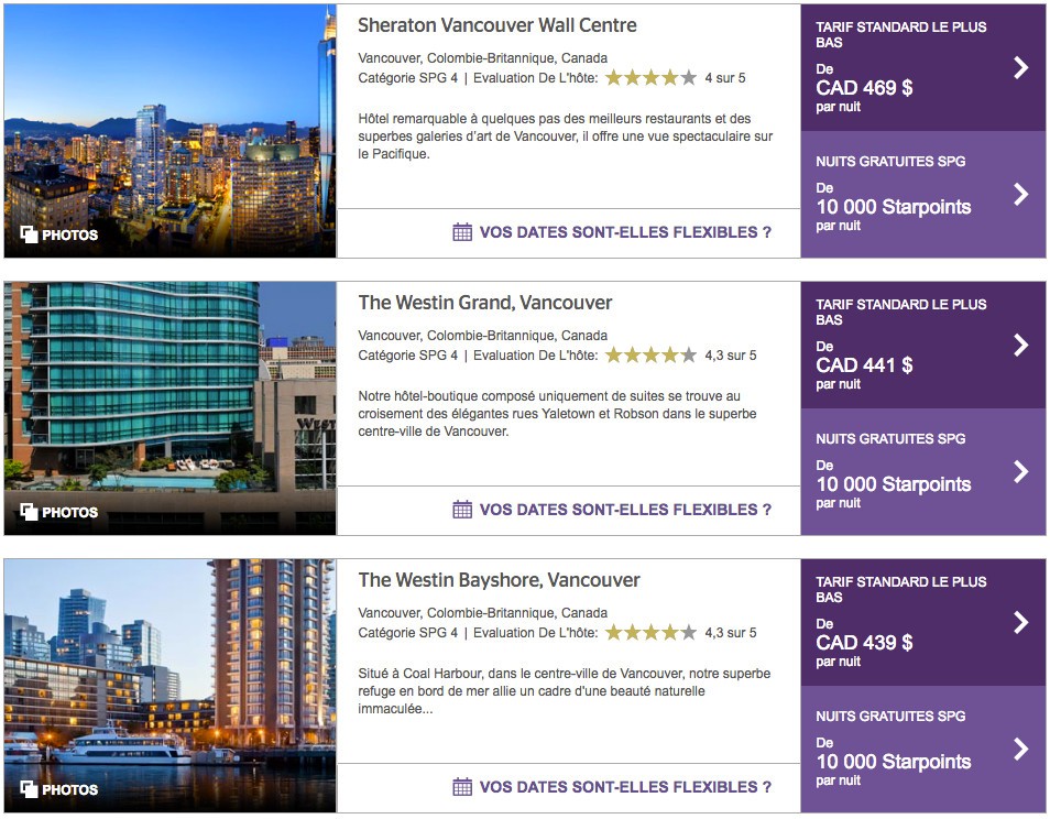 En plein coeur de Vancouver, ces 3 hôtels SPG offrent un excellent rapport qualité prix à 10 000 starpoints par nuit. Notez que les tarifs affichés sont hors taxes, alors que vos points comprennent toutes les taxes… une bien belle économie!