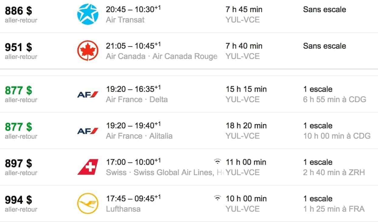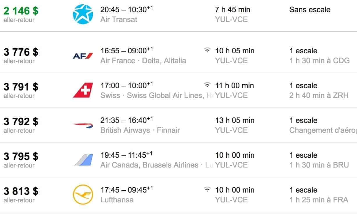 Voyons donc tout d’abord combien cela coûte de se rendre à Venise en payant son billet d’avion.