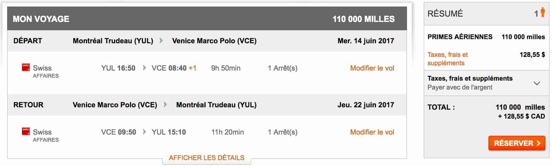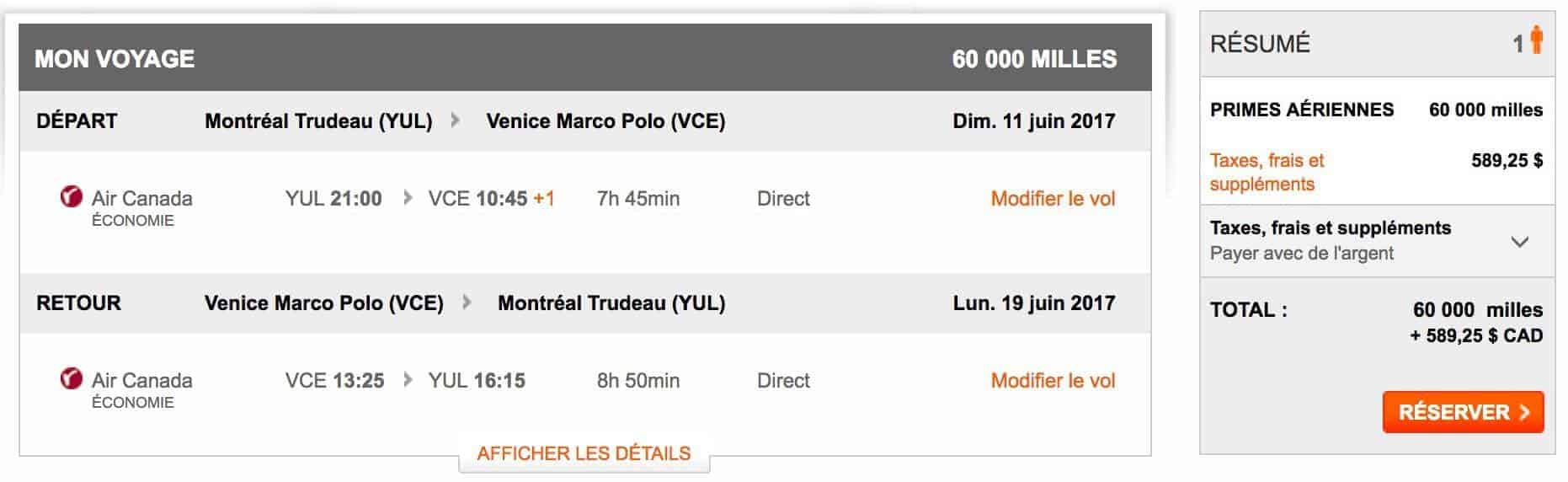Si vous souhaitez voyager avec un vol direct et un peu plus de confort, Air Canada propose la classe premium économie / économie privilège vers Venise pour 75 000 miles aéroplan… mais toujours un tarif élevé en taxes: 589$.