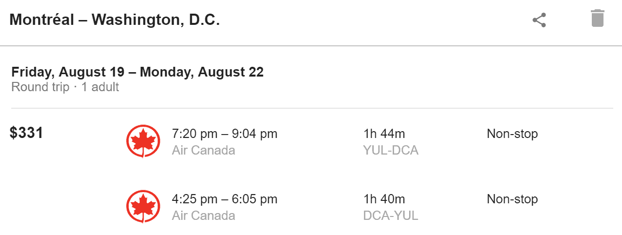 Nous vous conseillons donc de voyager sur Air Canada vers DCA pour une fin de semaine. Voici par exemple un billet sur Aéroplan au tarif de 15 000 milles et 195$ de taxes.