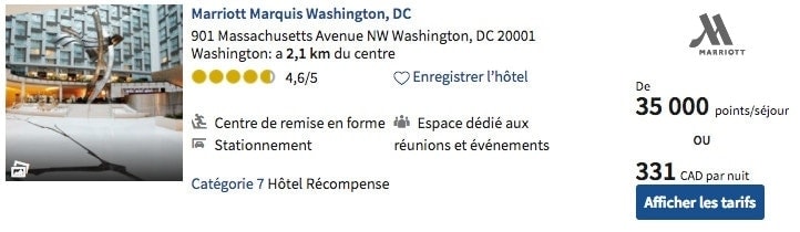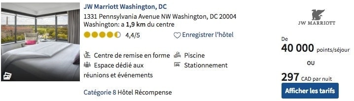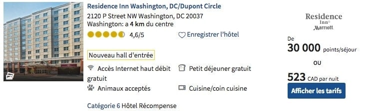 À Washington DC, il existe 21 hôtels du groupe hôtelier Marriott! Les moins onéreux commencent à 30 000 points Marriott Bonvoy par nuit (soit l’équivalent de 10 000 starpoints SPG) comme le Residence Inn Dupont Circle.