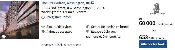 Enfin, si vous souhaitez faire une nuit dans un hôtel de luxe lors de votre séjour à Washington DC, vous pourriez vous offrir le Ritz-Carlton pour 60 000 points Marriott Bonvoy (soit l’équivalent de 20 000 starpoints SPG):