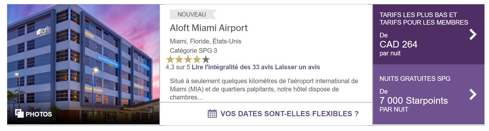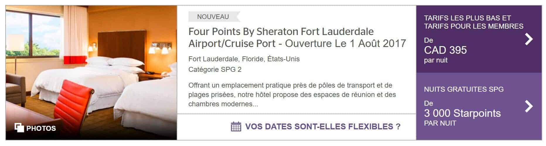 Ce nouvel hôtel, le Four Points Fort Lauderdale Airport – Cruise Port qui ouvre le 1er août 2017 a une situation idéale et est très accessible avec vos starpoints puisqu’il est catégorisé niveau 2 (soit 3000 starpoints / nuit en fin de semaine et 4000 starpoints en semaine). C’est même très étonnant comparativement au prix public ici en janvier 2018.