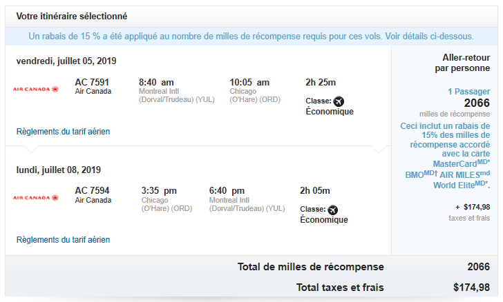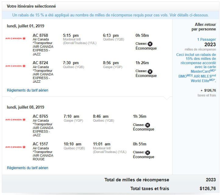 Je prends en compte l’avantage de 15% de réduction grâce à la Carte MasterCard BMO AIR MILES World Elite: si vous êtes un collecteur AIR MILES et que vous envisagez d’utiliser votre milles pour des billets d’avions, c’est une carte que vous vous DEVEZ d’avoir dans votre portefeuille !