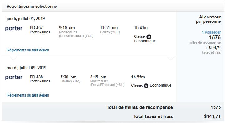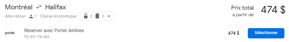 Toujours pour me coller à la réalité, j’ai choisi ici de privilégier un vol direct plutôt qu’un, un peu moins cher, avec une correspondance. Cette fois-ci le vol est sur Porter.