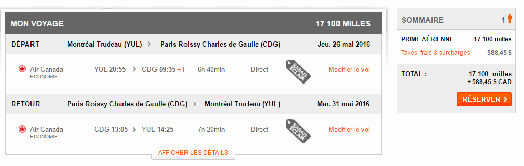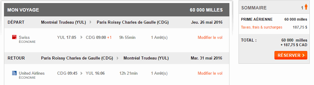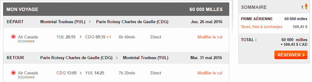 Ce même vol en primes à « miles fixes » coûte 60 000 miles et 588$.
