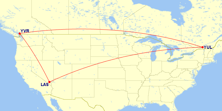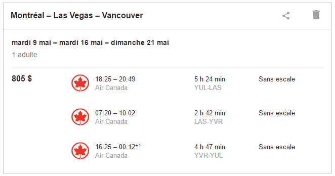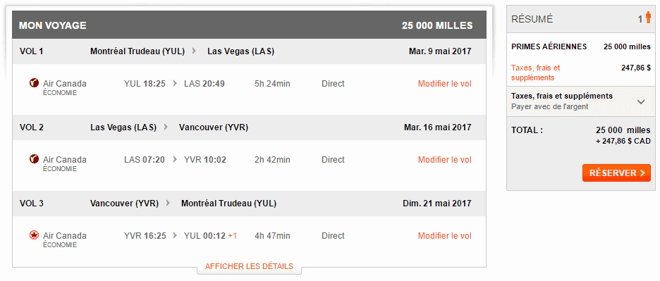 Pourquoi ne pas transformer votre voyage en un vol multi-villes ? Voici un exemple entre Montréal-Las Vegas- Vancouver – Montréal pour seulement 25 000 miles Aéroplan.