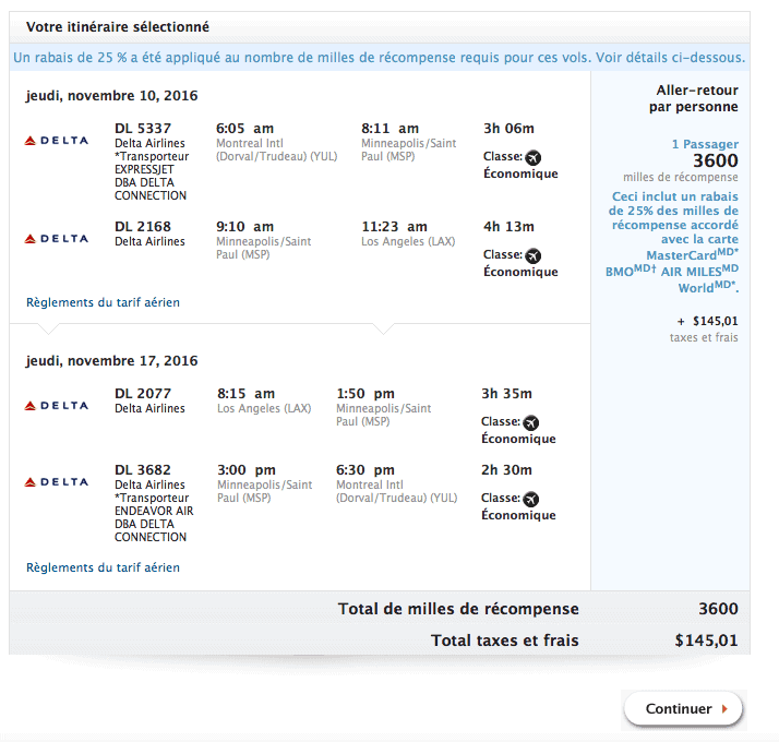 Les vols proposés sont opérés par Delta Airlines avec des escales plutôt courtes. Le tarif est de 3 600 miles et 145$ de taxes.