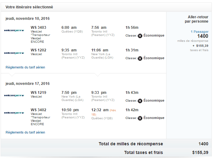 Commençons avec une recherche pour un vol court-courrier en basse-saison avec AIR MILES sur l’itinéraire Québec-New-York.