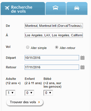 Une fois dans cette section, il s’agit d’un moteur de recherche classique pour des billets d’avions.